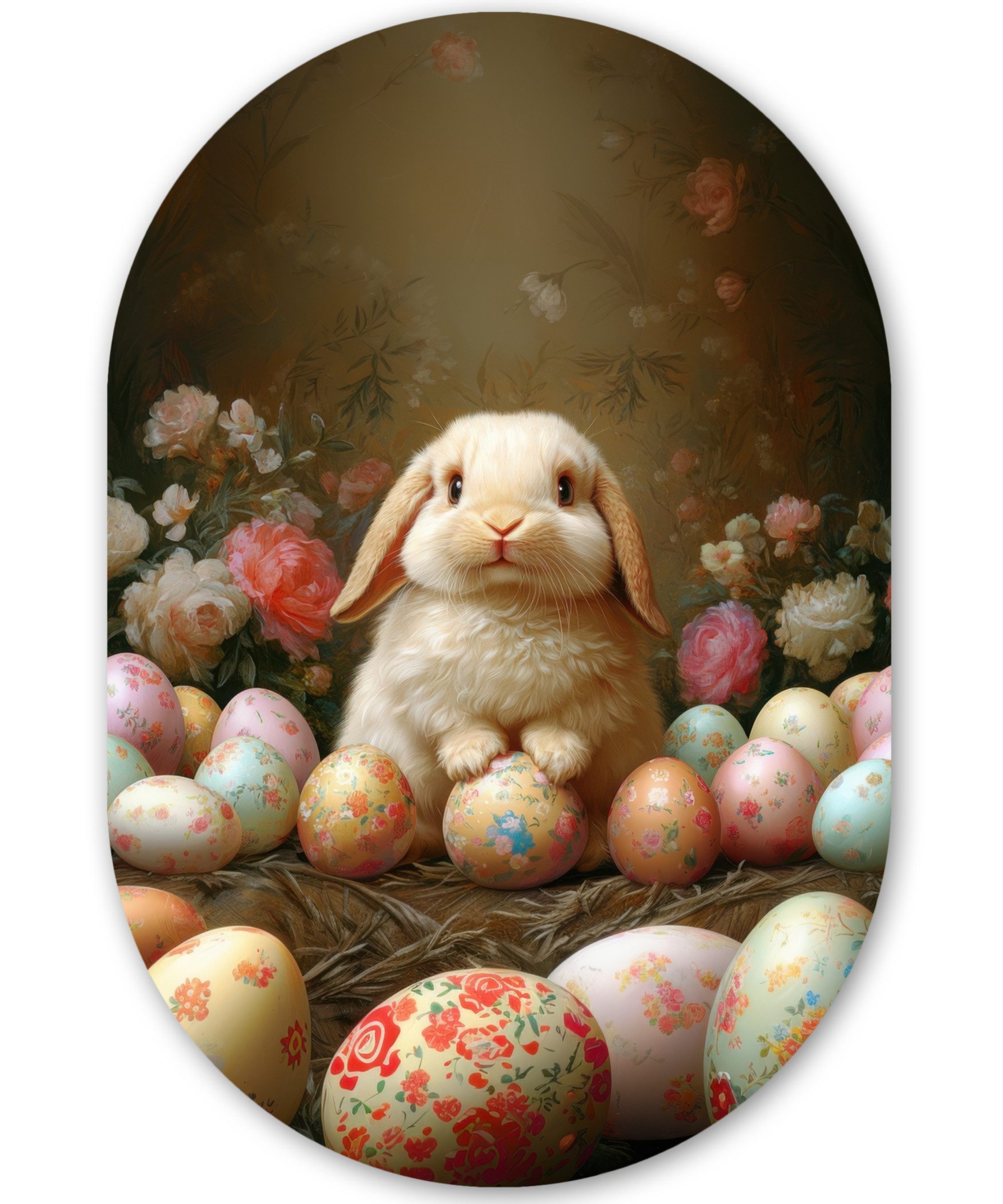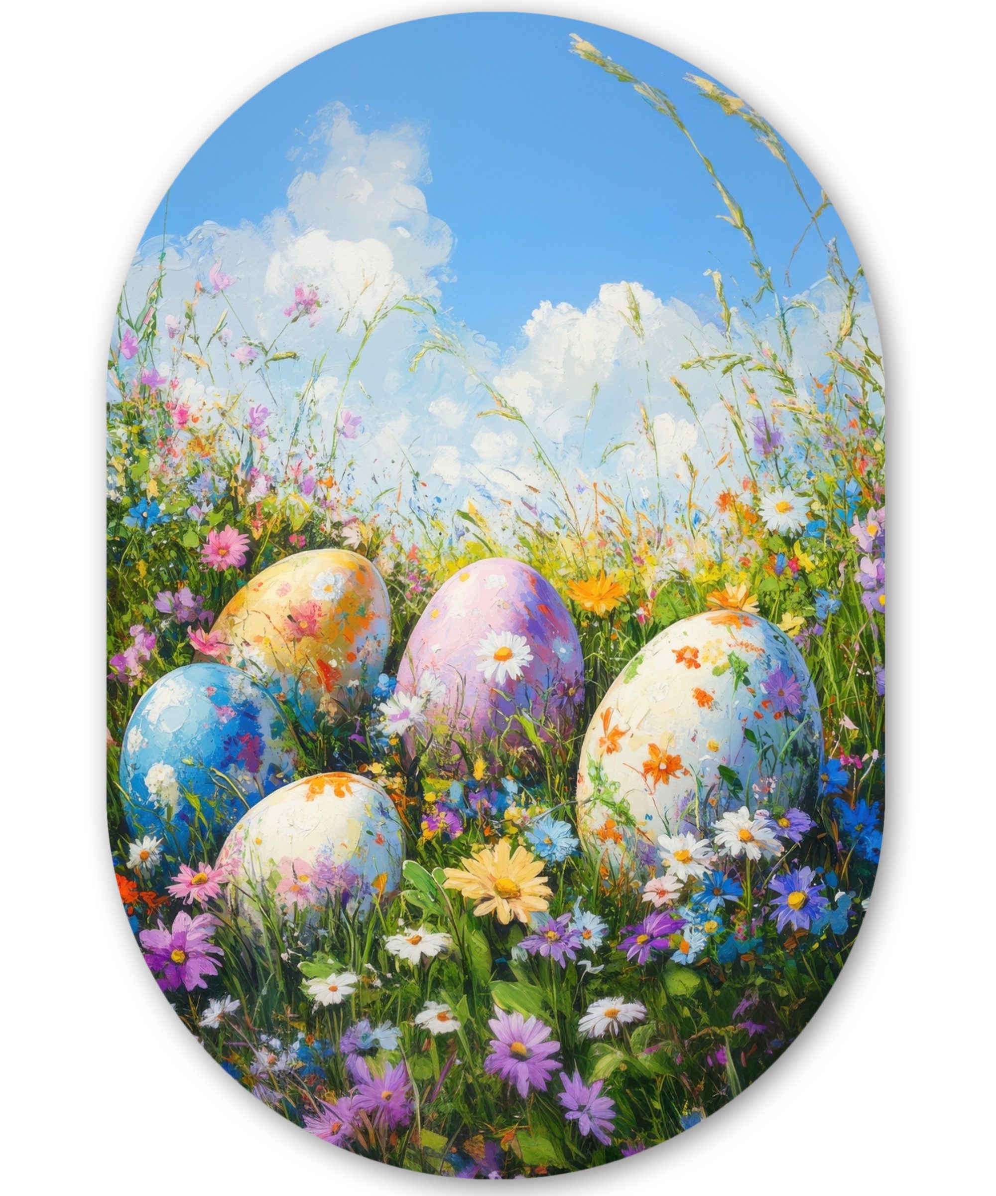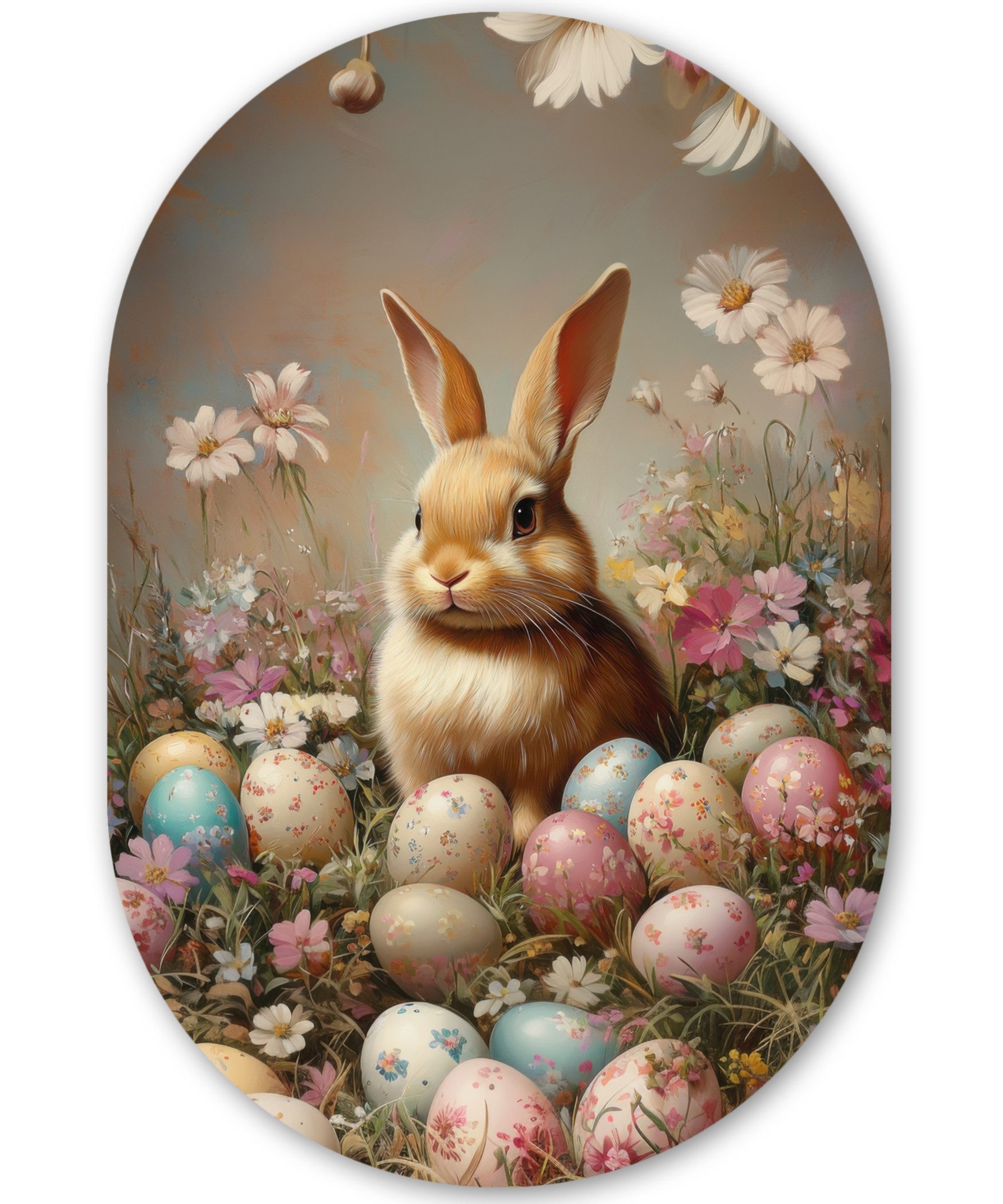 Ein verspielter Hase sitzt auf einem Turm aus schön verzierten Ostereiern. In seinen Pfoten hält er ein grünes Ei, während der Himmel im Hintergrund mit weichen Wolken gefüllt ist.Kunstgenre | Modern, Natur, Tiere, Abstrakt, Kinderzimmer |