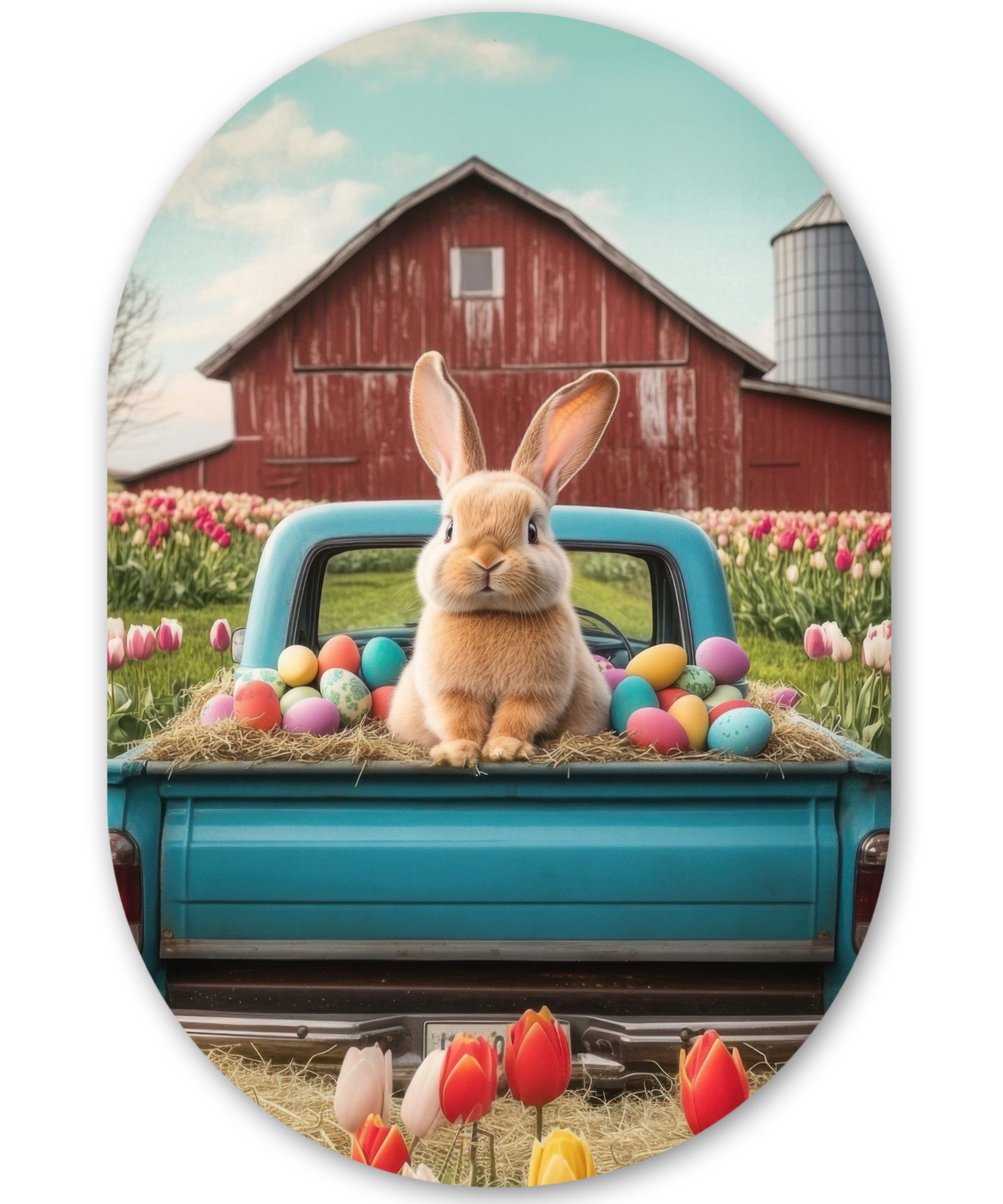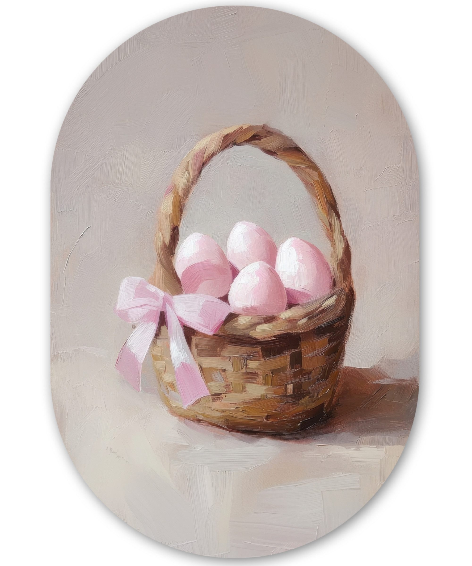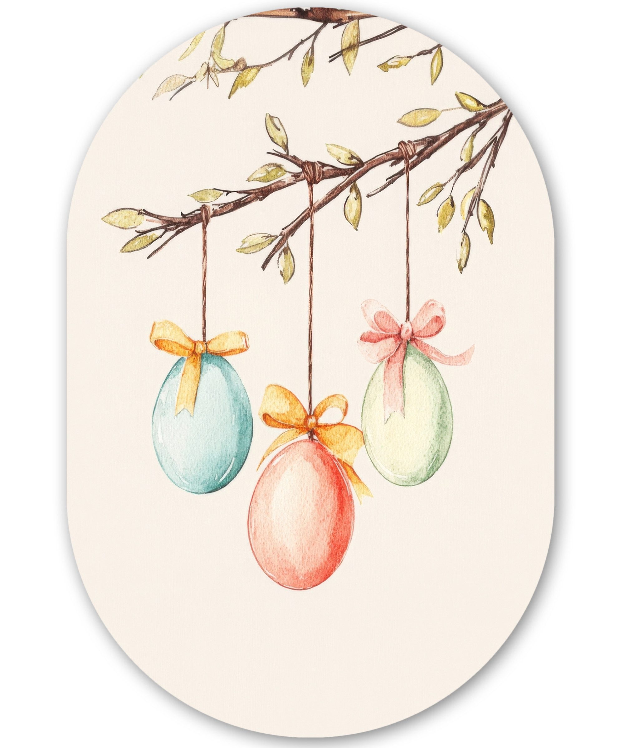 Ein verspielter Hase sitzt auf einem Turm aus schön verzierten Ostereiern. In seinen Pfoten hält er ein grünes Ei, während der Himmel im Hintergrund mit weichen Wolken gefüllt ist.Kunstgenre | Modern, Natur, Tiere, Abstrakt, Kinderzimmer |