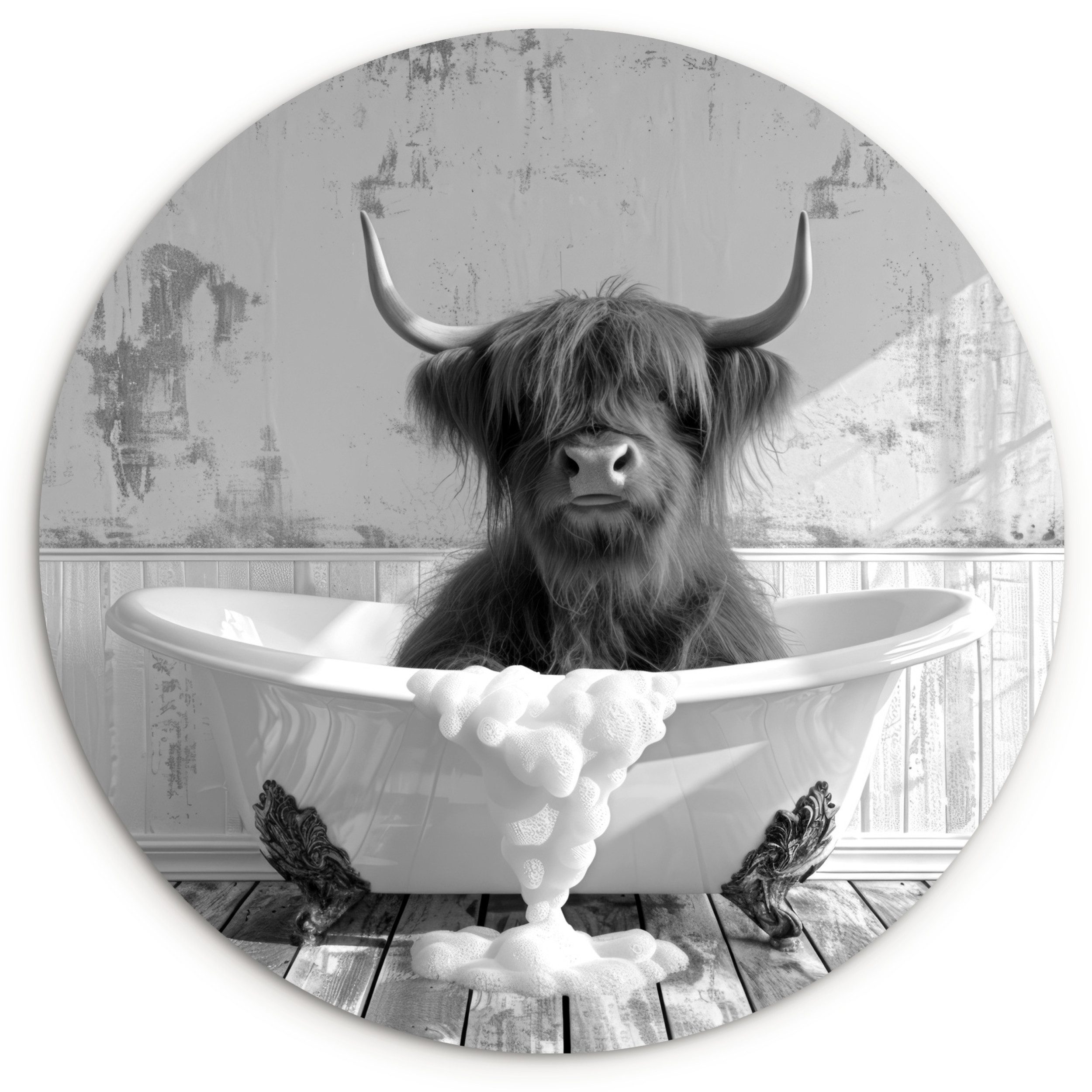 Ein schottischer Highlander in einem Schaumbad in Schwarz und Weiß.