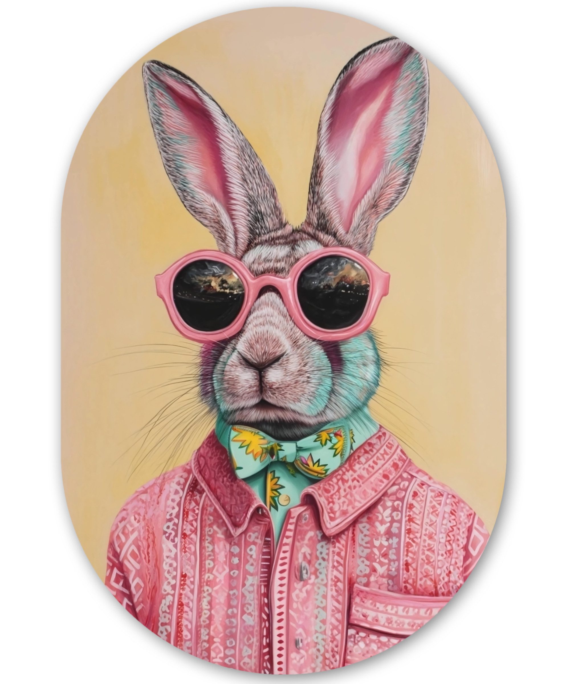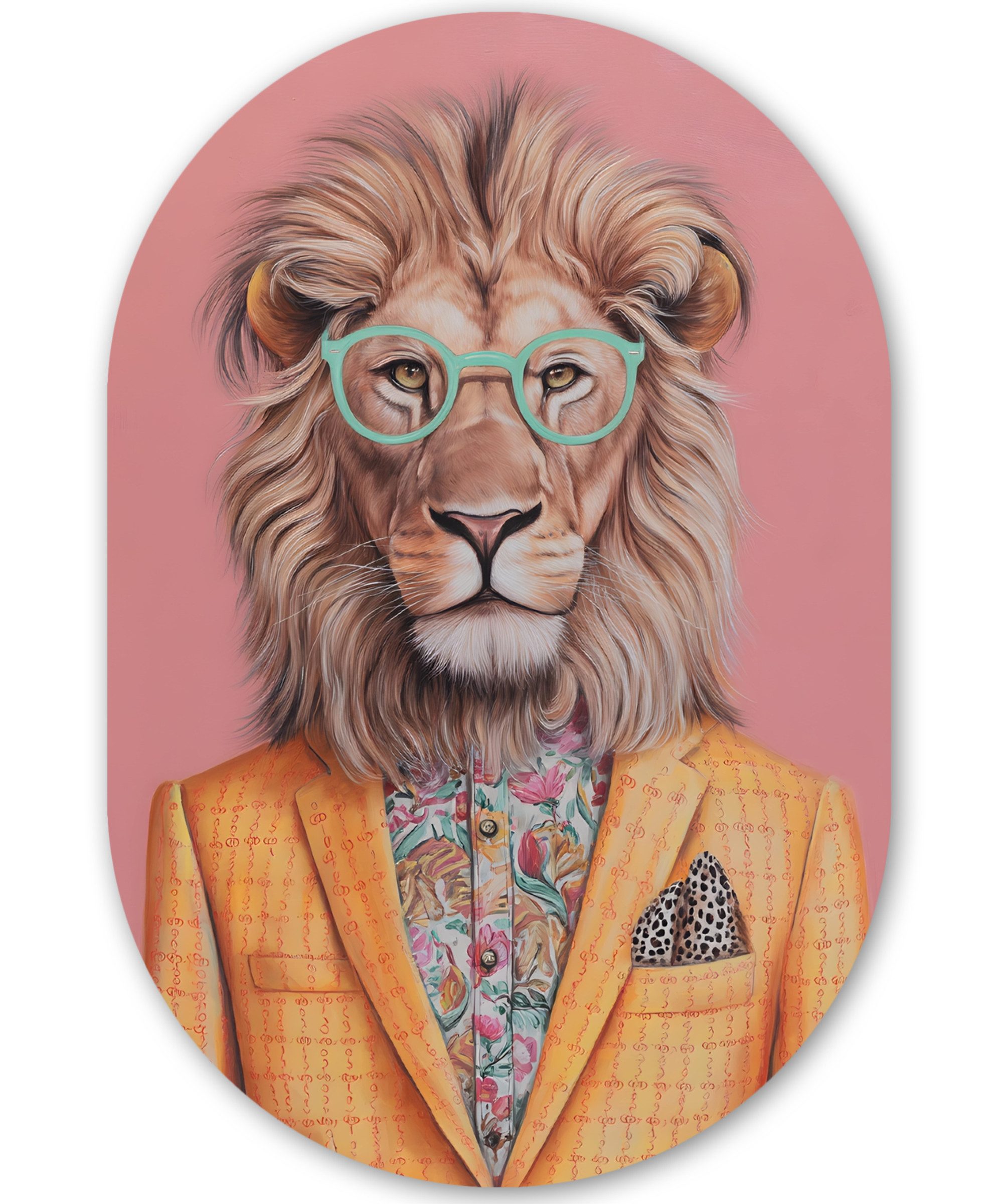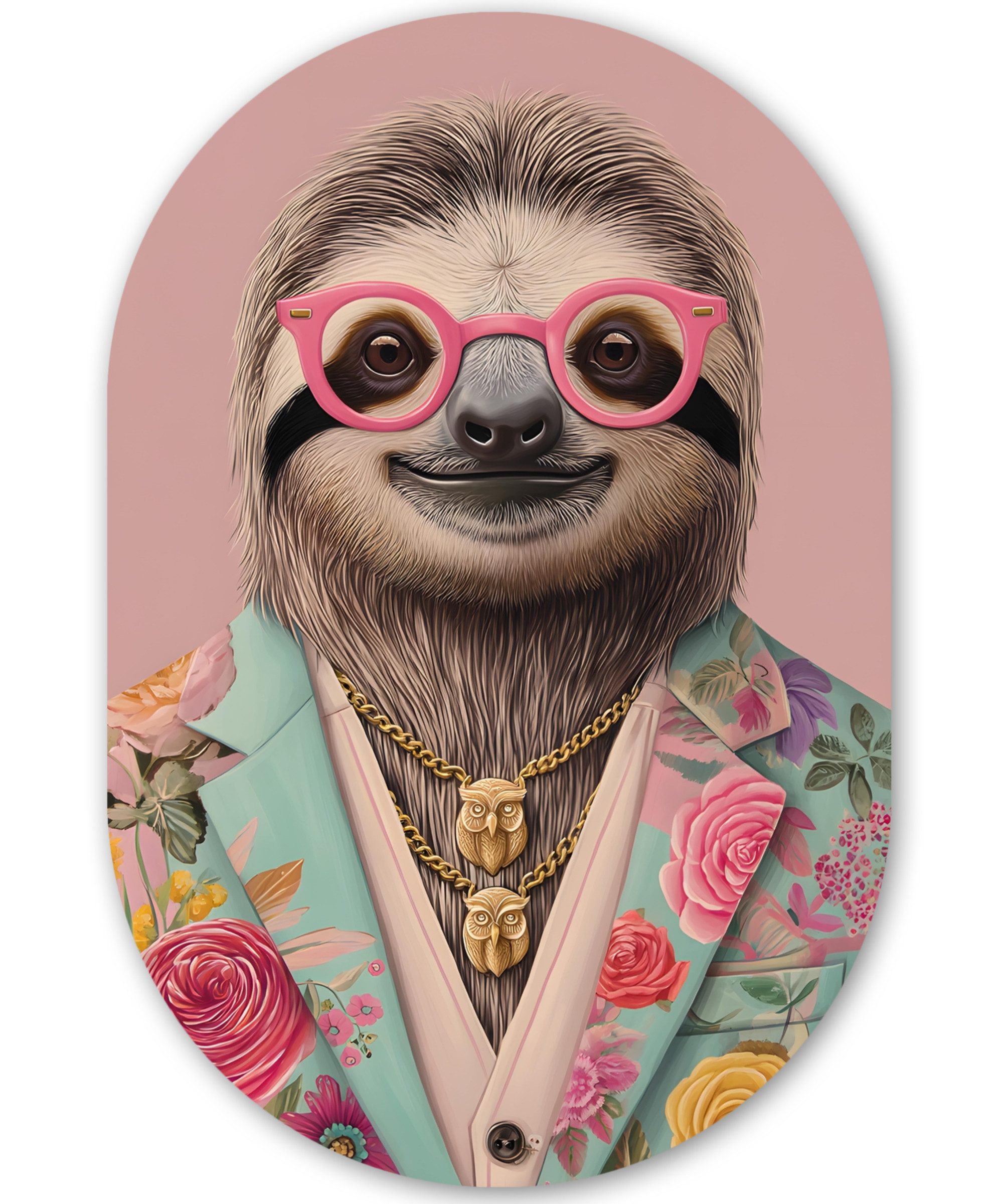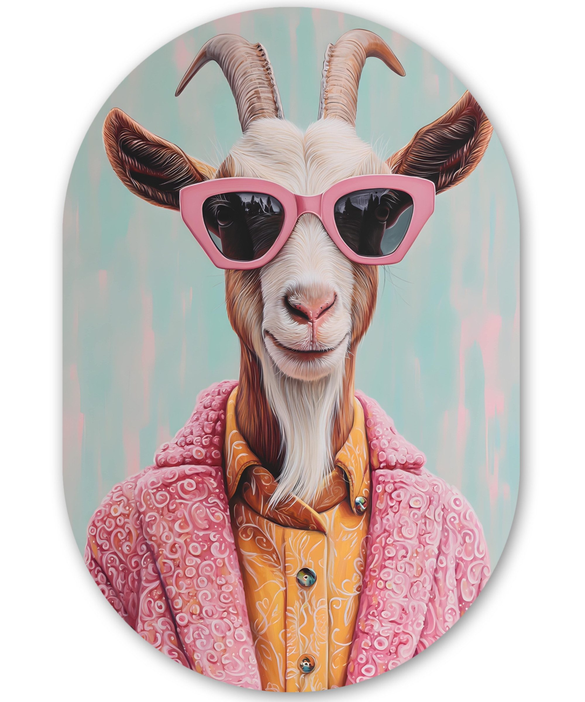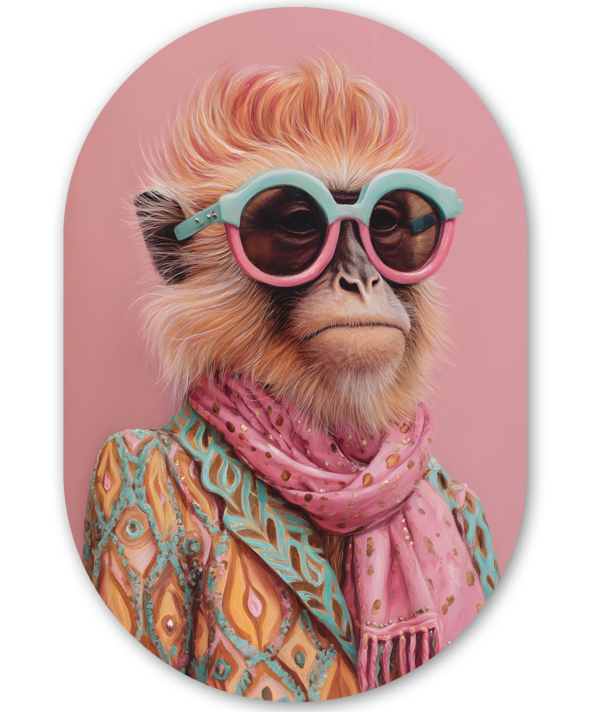 Ein Affe mit orangefarbenem Haar trägt eine blaue Sonnenbrille, einen rosa Schal und eine Jacke mit geometrischem Muster vor einem rosa Hintergrund.Kunstgenre | Modern, Natur, Tiere, Abstrakt, Kinderzimmer |