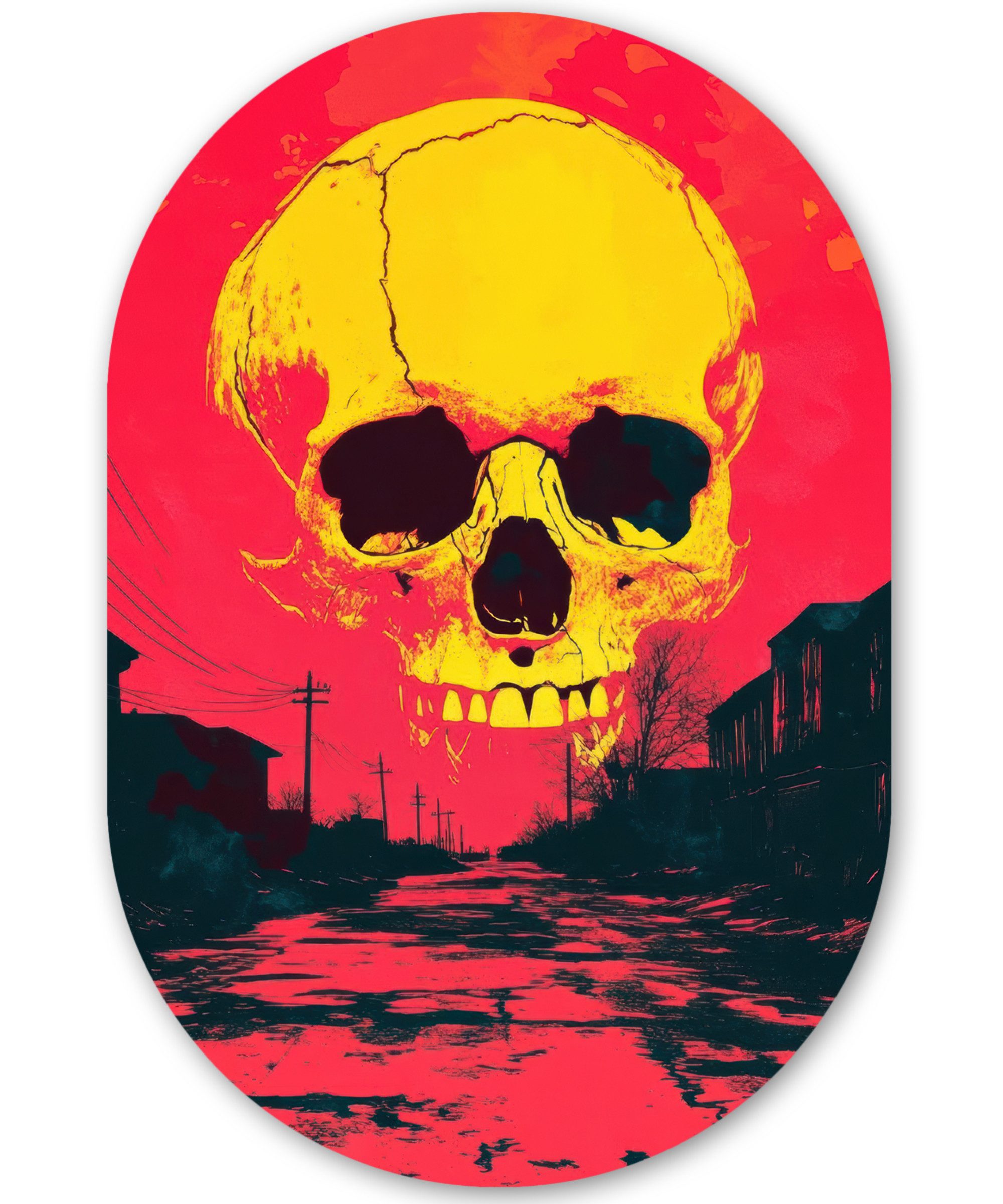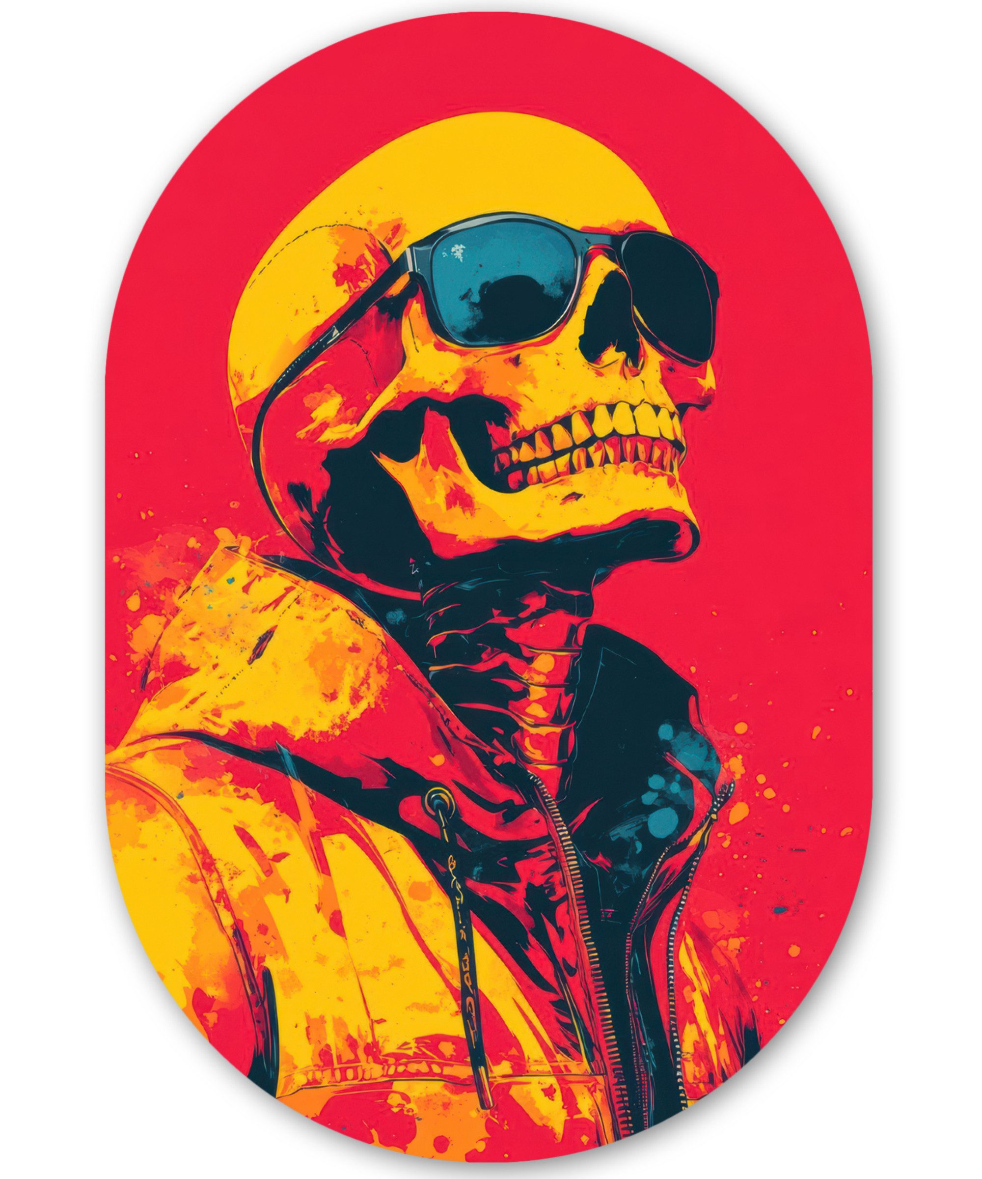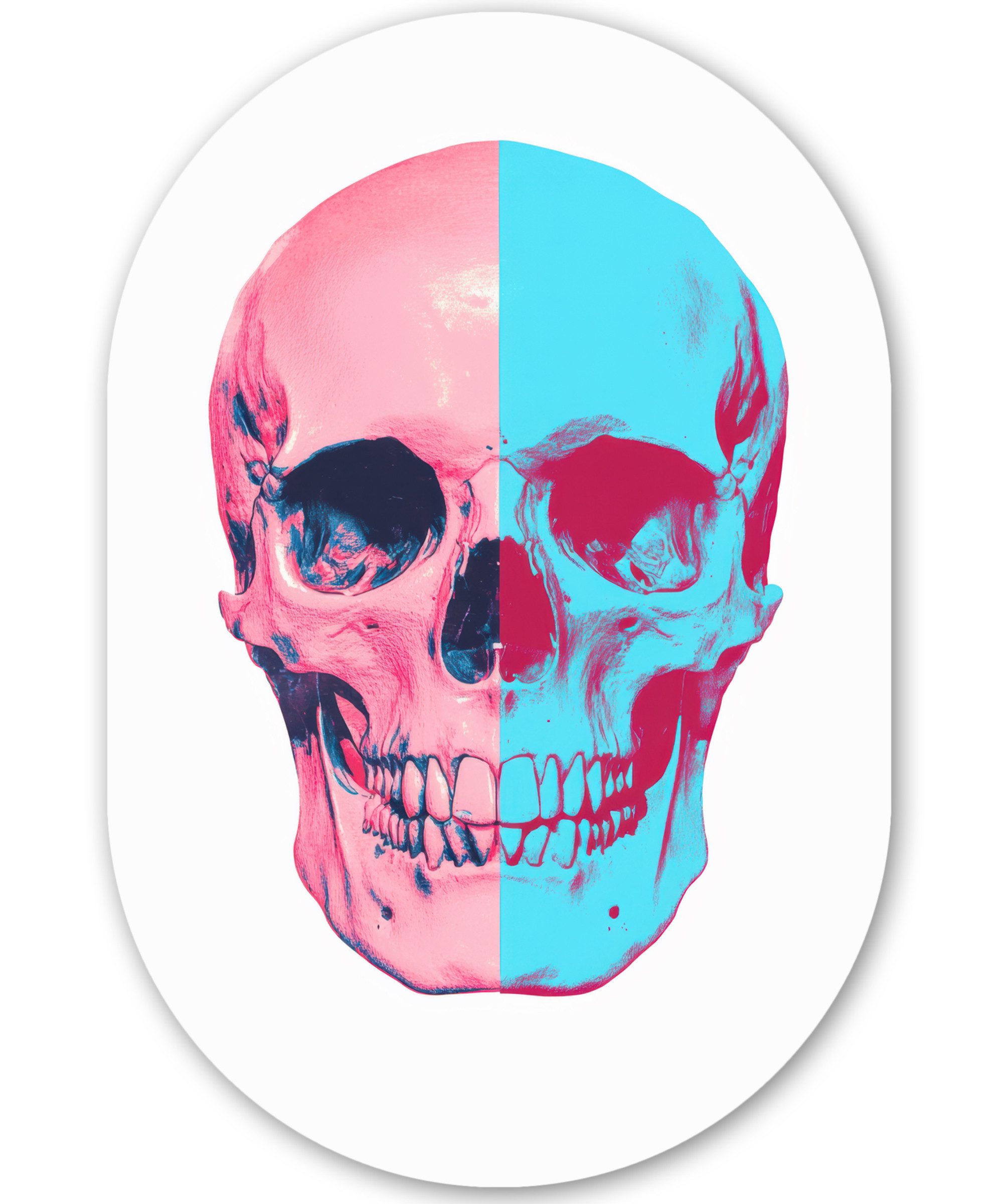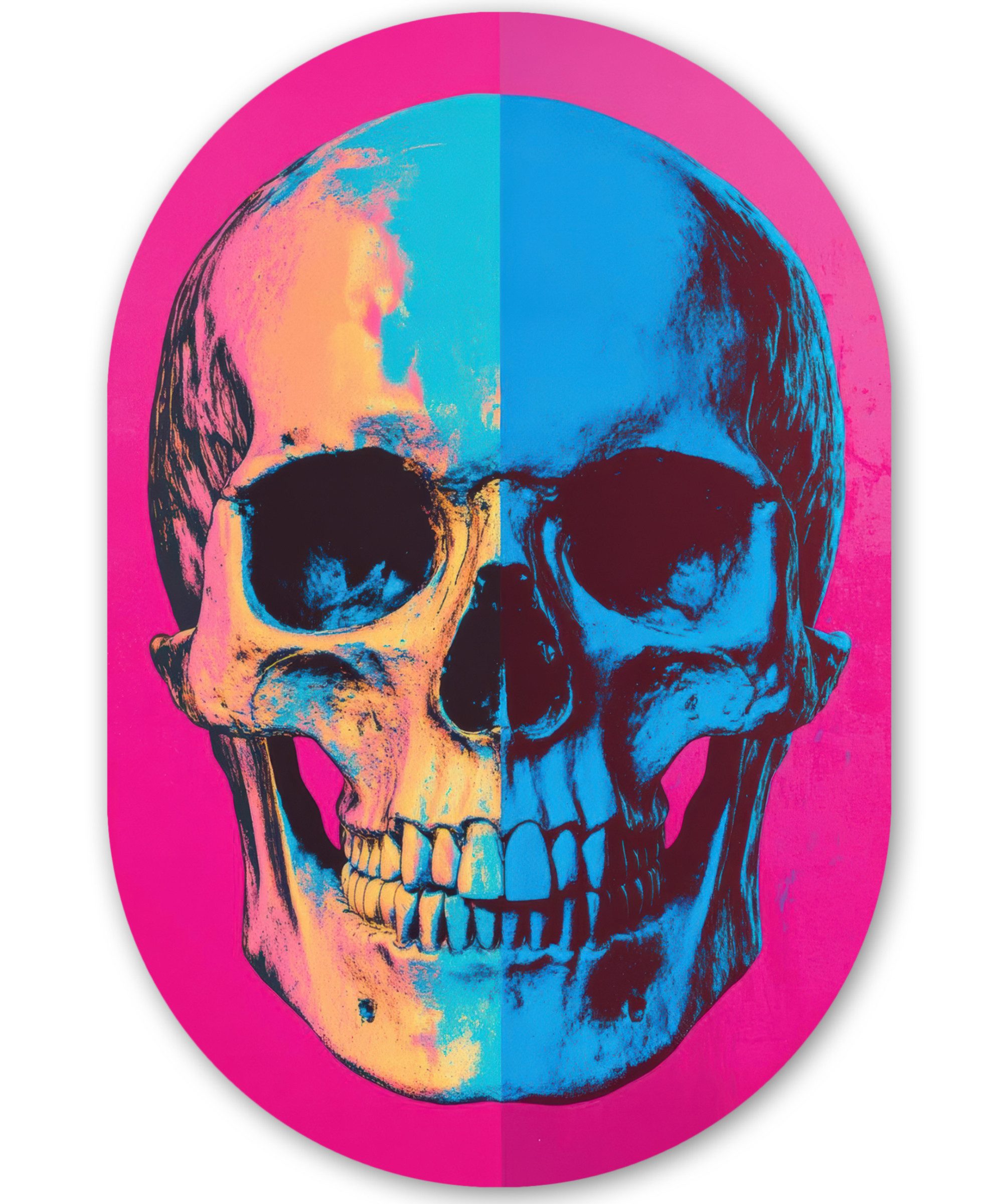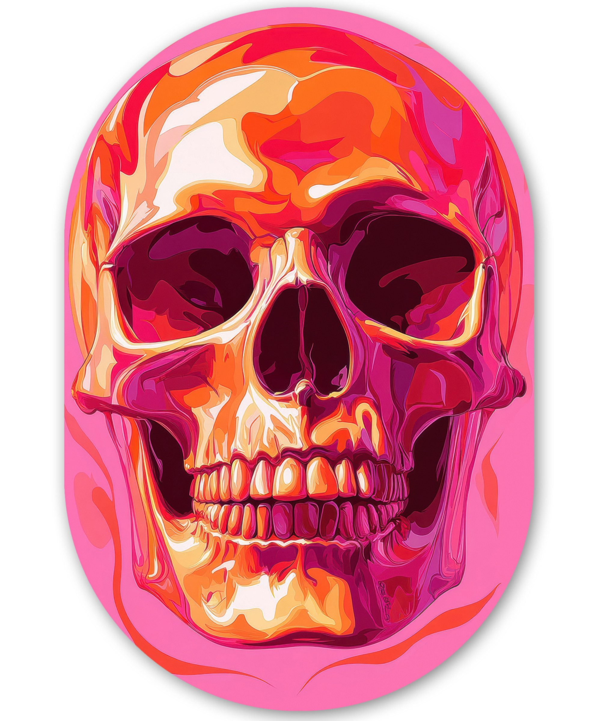 Totenkopf in Neongelb und Blau mit einem leuchtend rosa Hintergrund. Der Stil strahlt Pop-Art-Energie aus.Kunstgenre | Modern, Natur, Tiere, Abstrakt, Kinderzimmer |