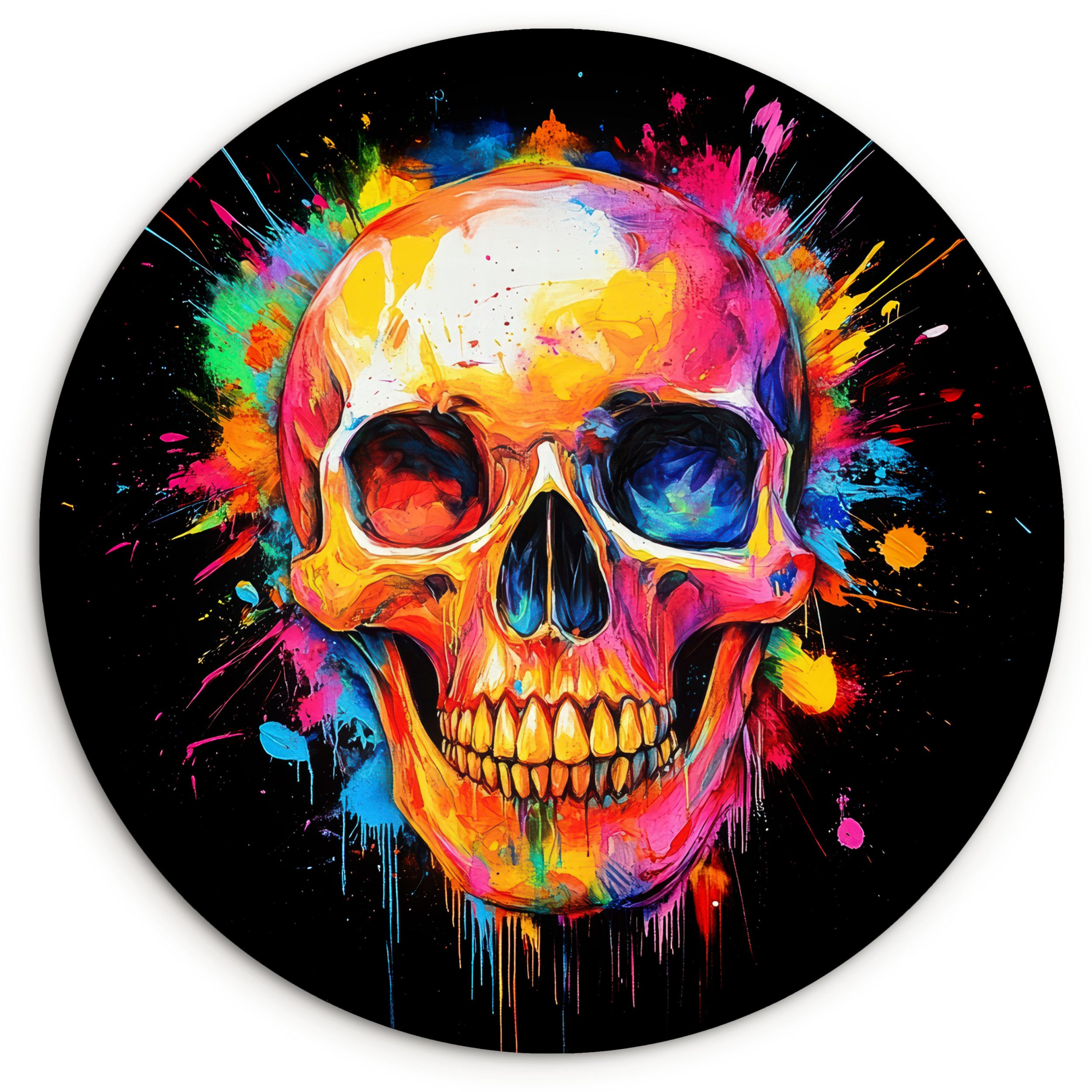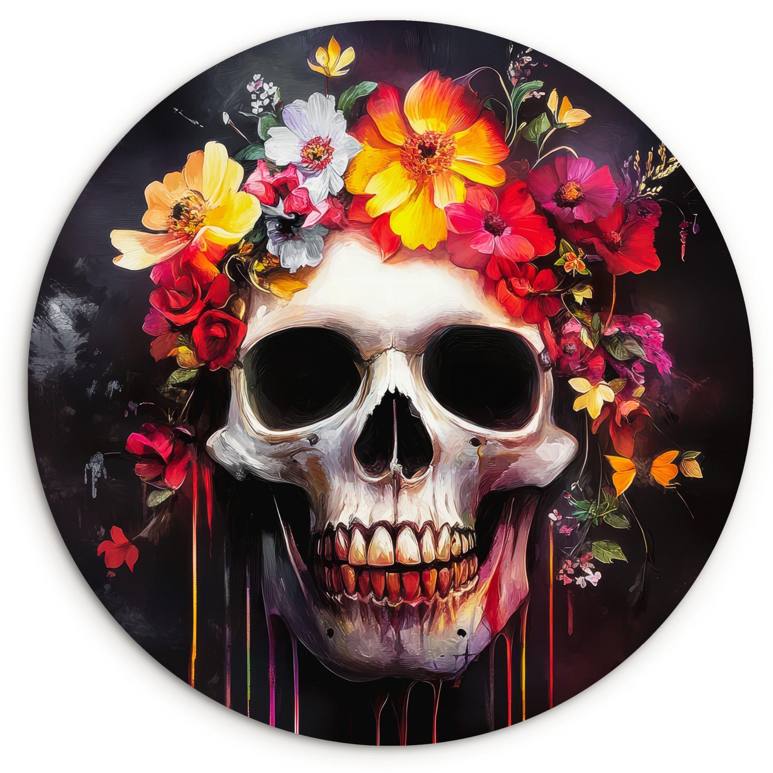 Schädel mit bunten Blumen als Haare. Blut tropft von den Zähnen des Schädels. Das Bild hat einen schwarzen Hintergrund.