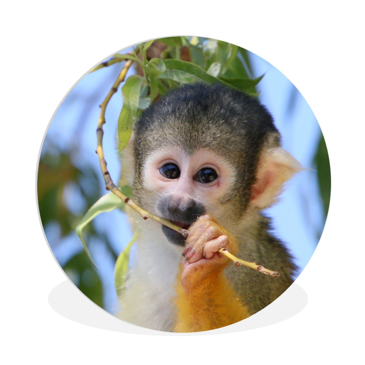 Eine liebenswerte Nahaufnahme eines jungen Totenkopfäffchens, das seinen ungewöhnlichen Namen der Form seines Fells im Gesicht verdankt. Mit seinen dunklen Augen schaut er direkt in die Kamera, während er auf einen dünnen Ast beißt. Dieses Bild passt perfekt in das Innere des Wohnzimmers.
