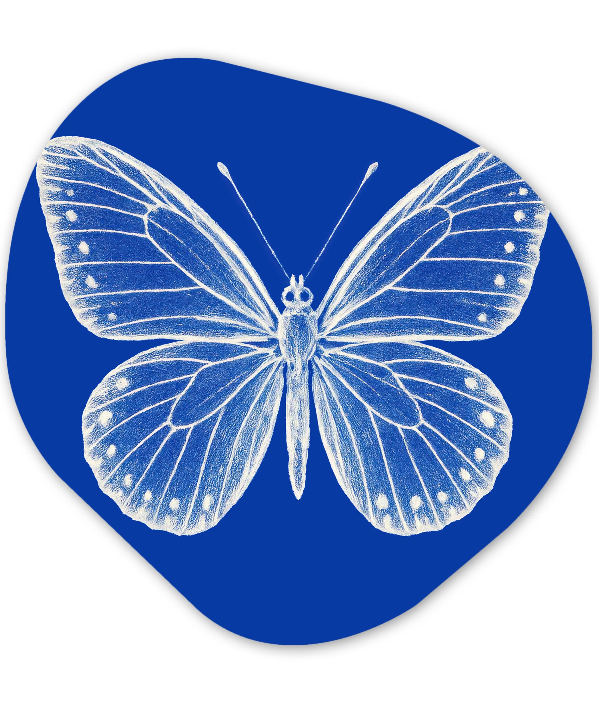 Ein weißer Schmetterling mit detaillierten Adern und Punkten ist dicht vor einem tiefblauen Hintergrund gezeichnet. Das Bild erinnert an eine botanische Illustration.Kunstgenre | Modern, Natur, Tiere, Abstrakt, Kinderzimmer |