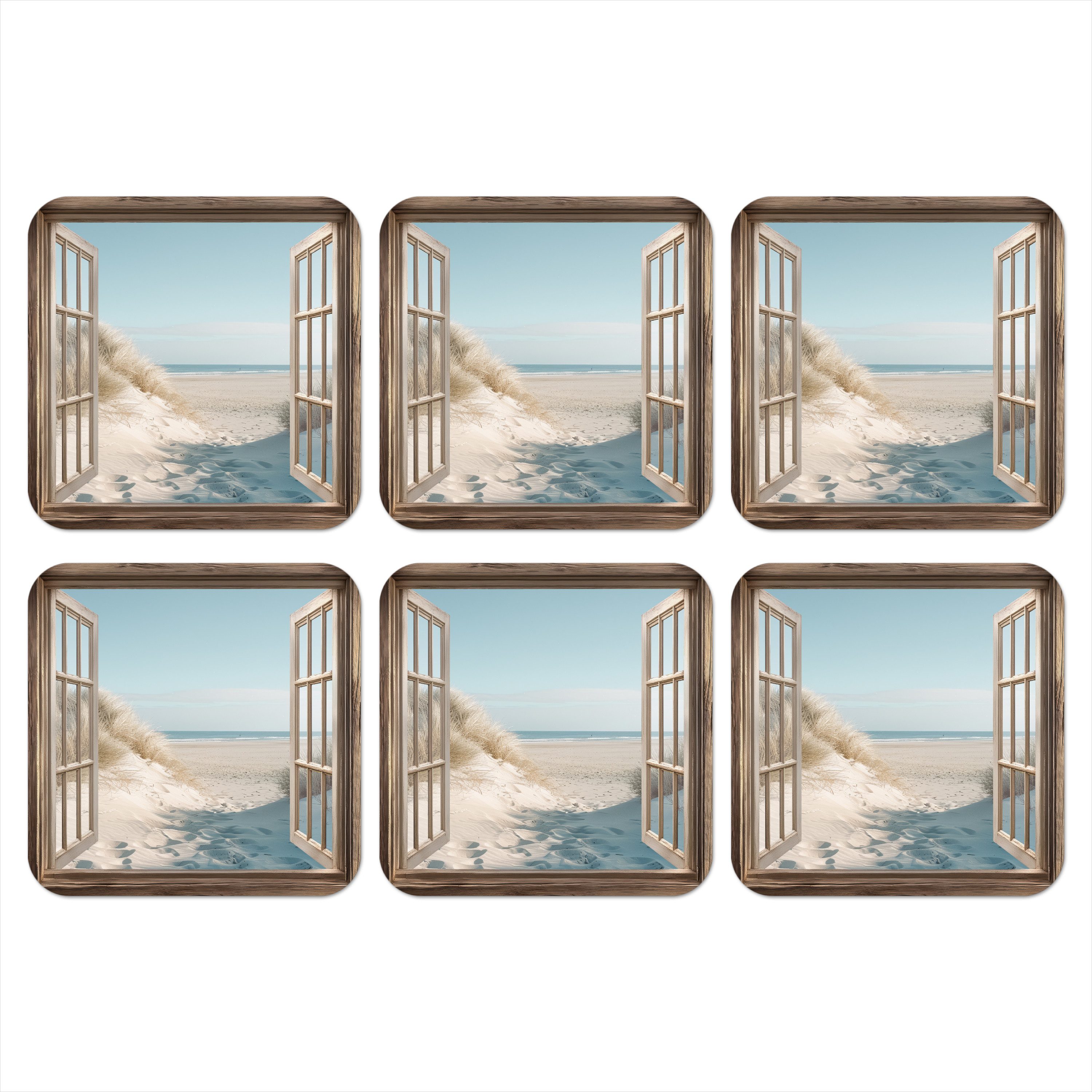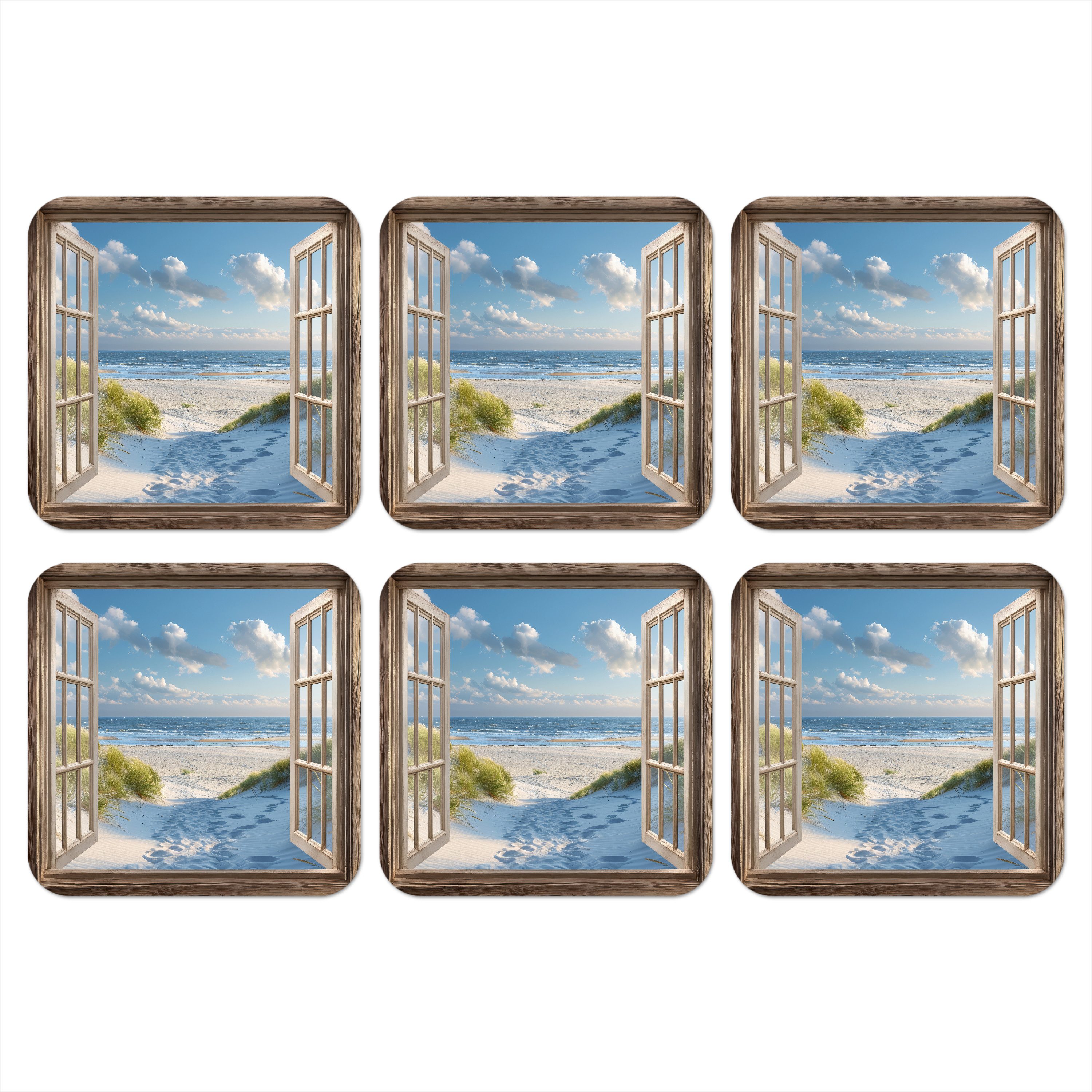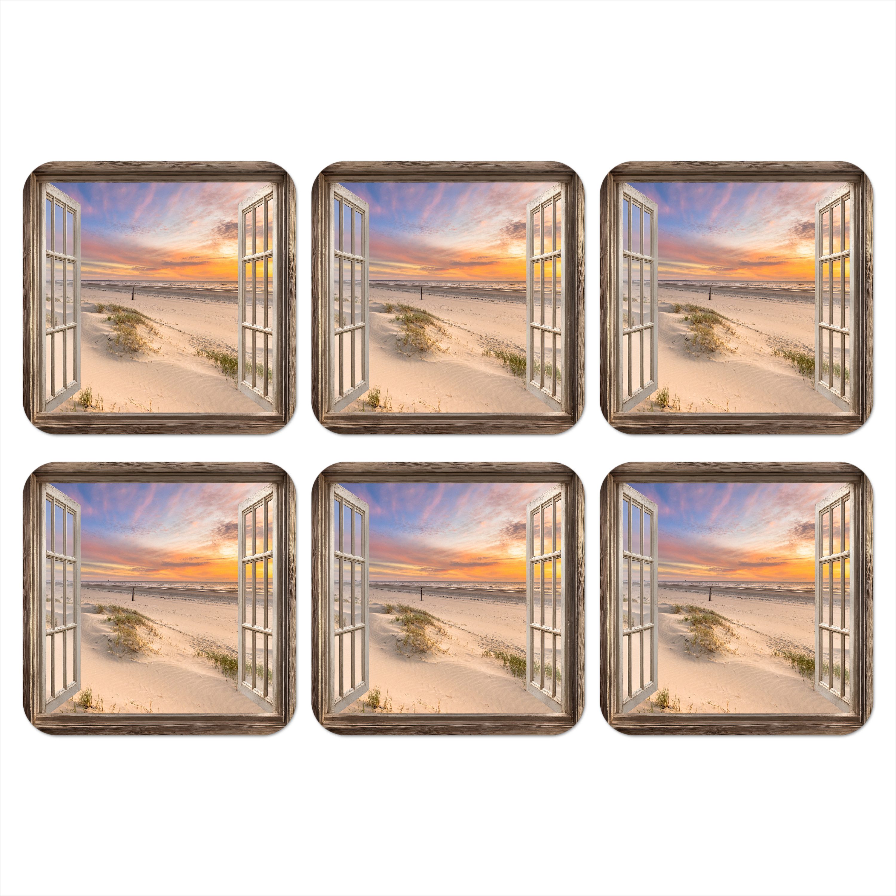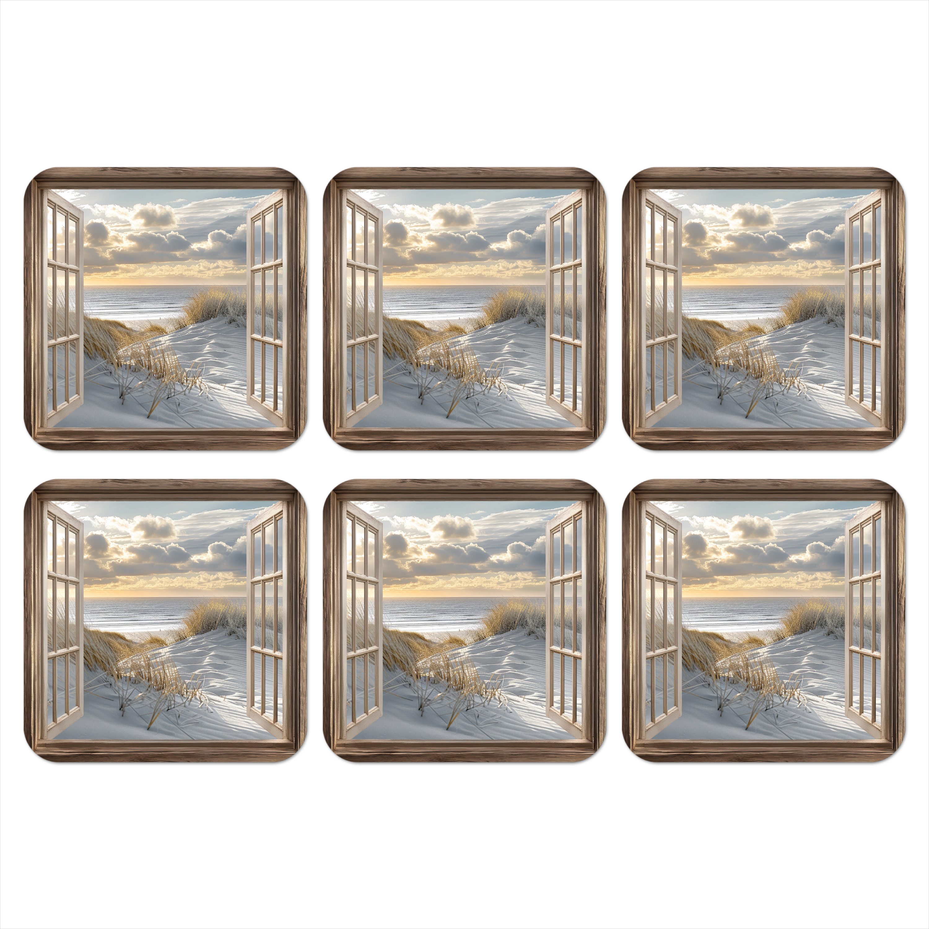 Blick auf eine Strandlandschaft, gesehen durch ein offenes Fenster. Die Dünen sind mit Strandhafer bewachsen, während die Sonne hinter den Wolken scheint und einen goldenen Schimmer auf das Meer wirft.