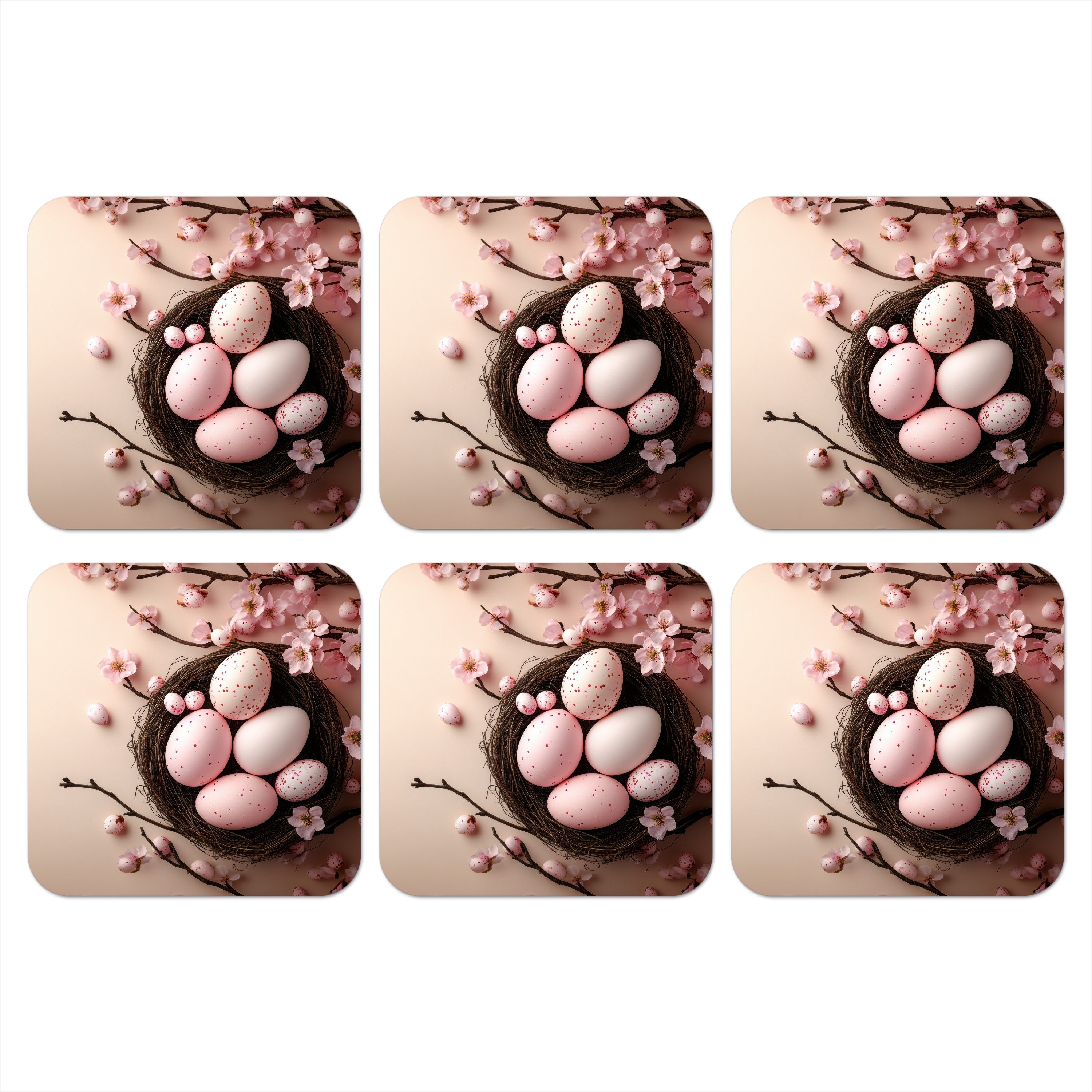 Ein Nest mit rosa gesprenkelten Ostereiern liegt zwischen zarten Blütenzweigen. Die warmen, sanften Töne und raffinierten Details schaffen eine romantische und elegante Osteratmosphäre.