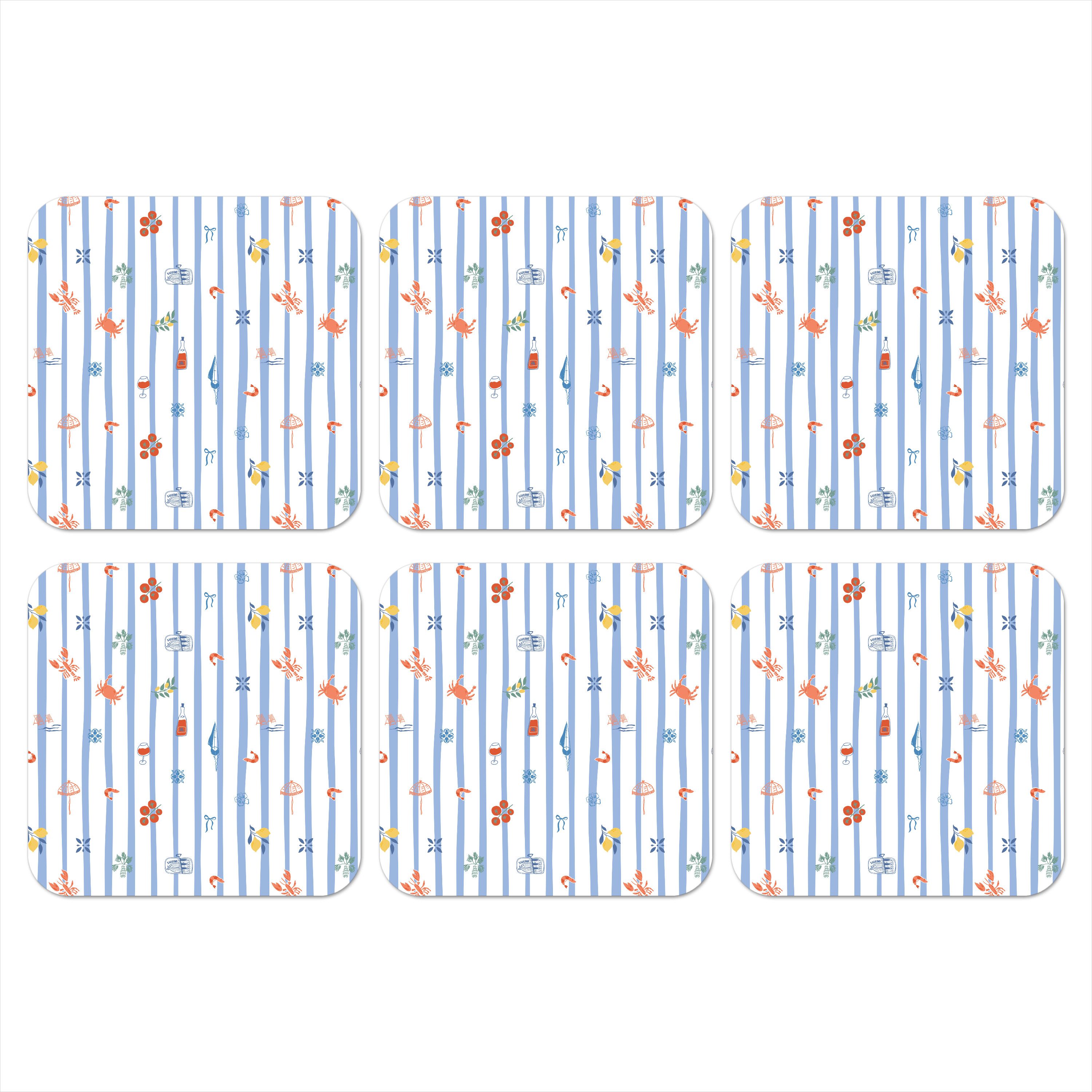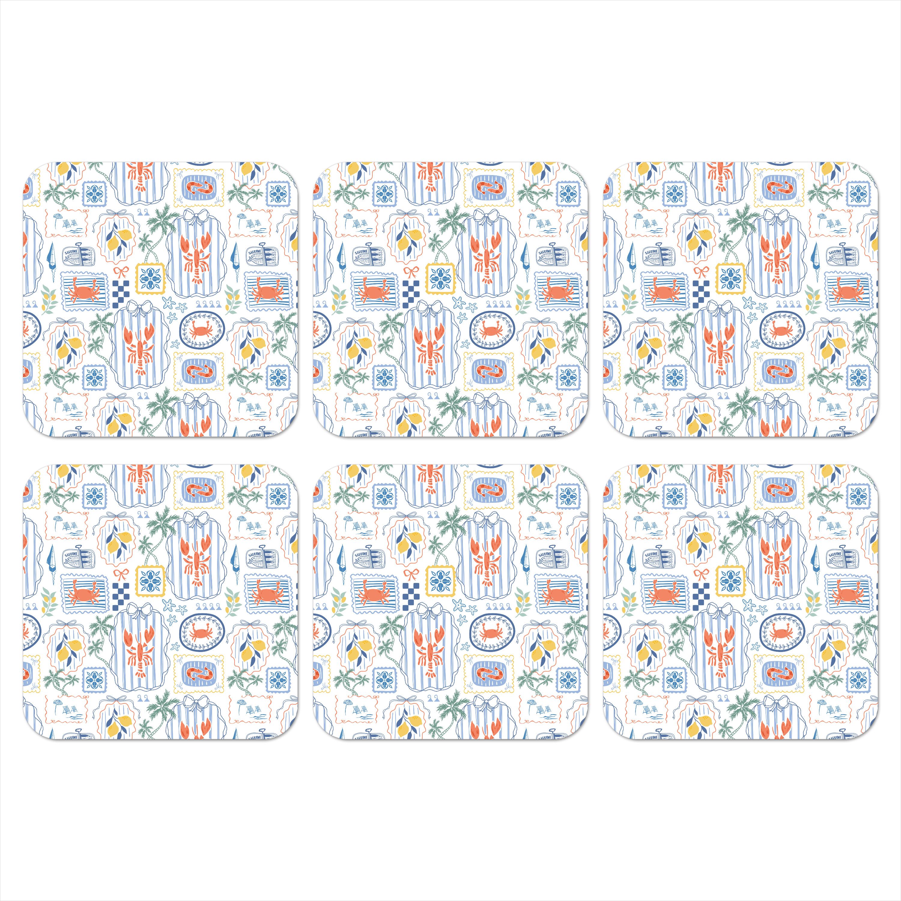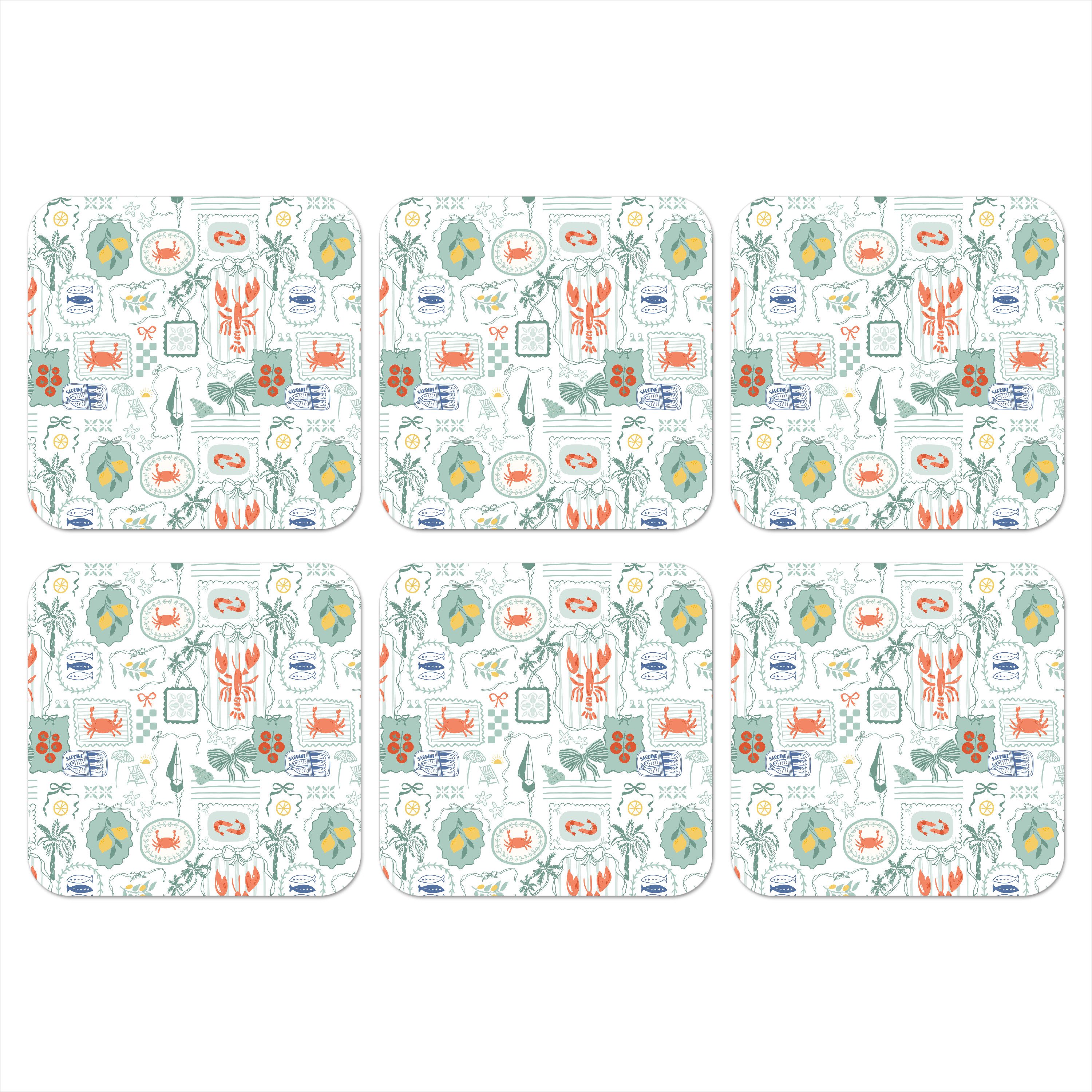 Illustriertes Muster mit eingerahmten Motiven von Hummern, Krabben, Palmen, Fischen, Zitronen, Tomaten und Segelschiffen. Umrandet mit Schleifen und Linien in Grün, Rot und Blau auf weißem Hintergrund. Eine verspielte Komposition, die an Urlaubsbriefmarken oder Kacheltafeln erinnert.