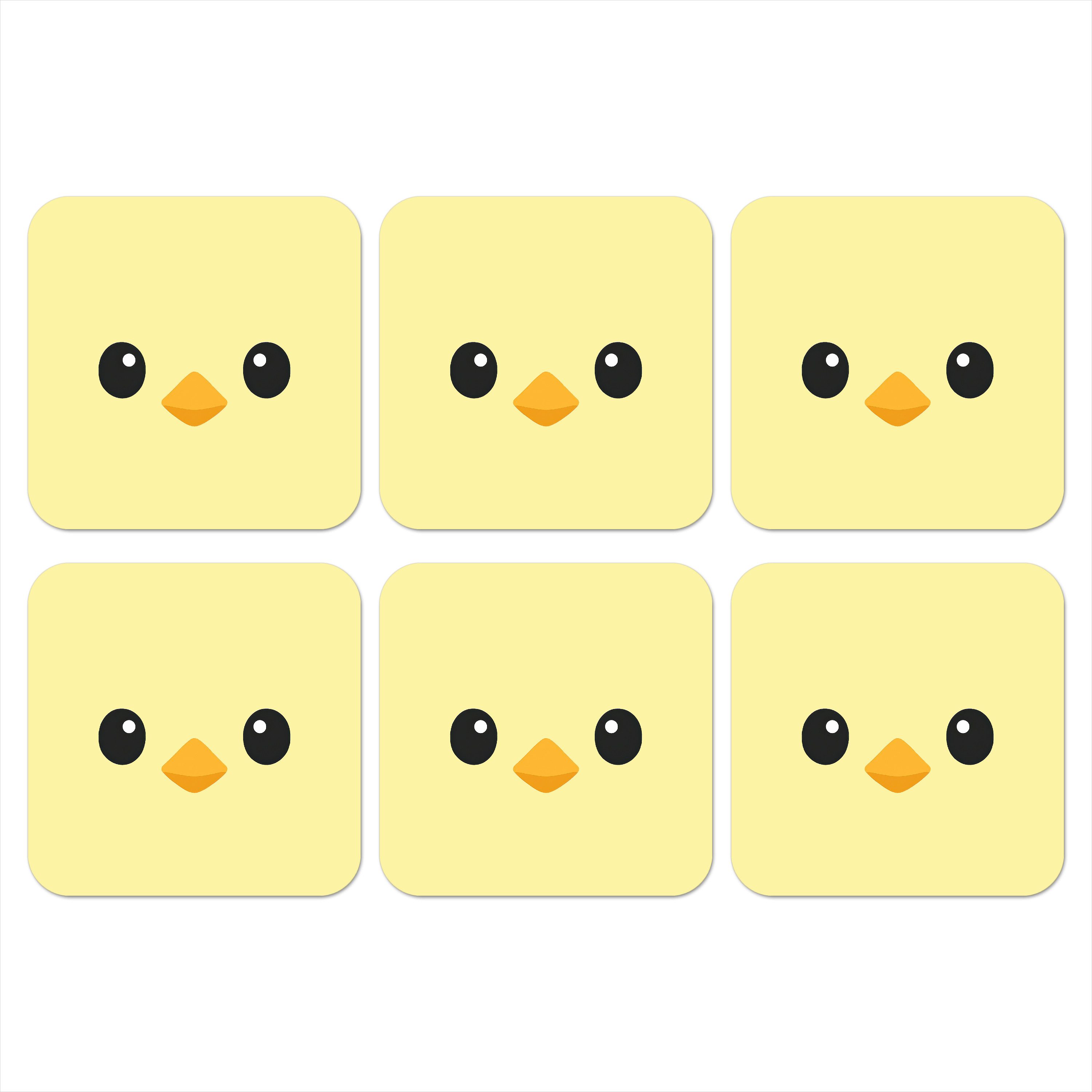 Ein minimalistisches Kükengesicht mit großen schwarzen Augen und einem orangefarbenen Schnabel ist auf einem schlichten blassgelben Hintergrund zentriert. Der einfache Stil und die sanften Farben verleihen ihm einen niedlichen und fröhlichen Look.