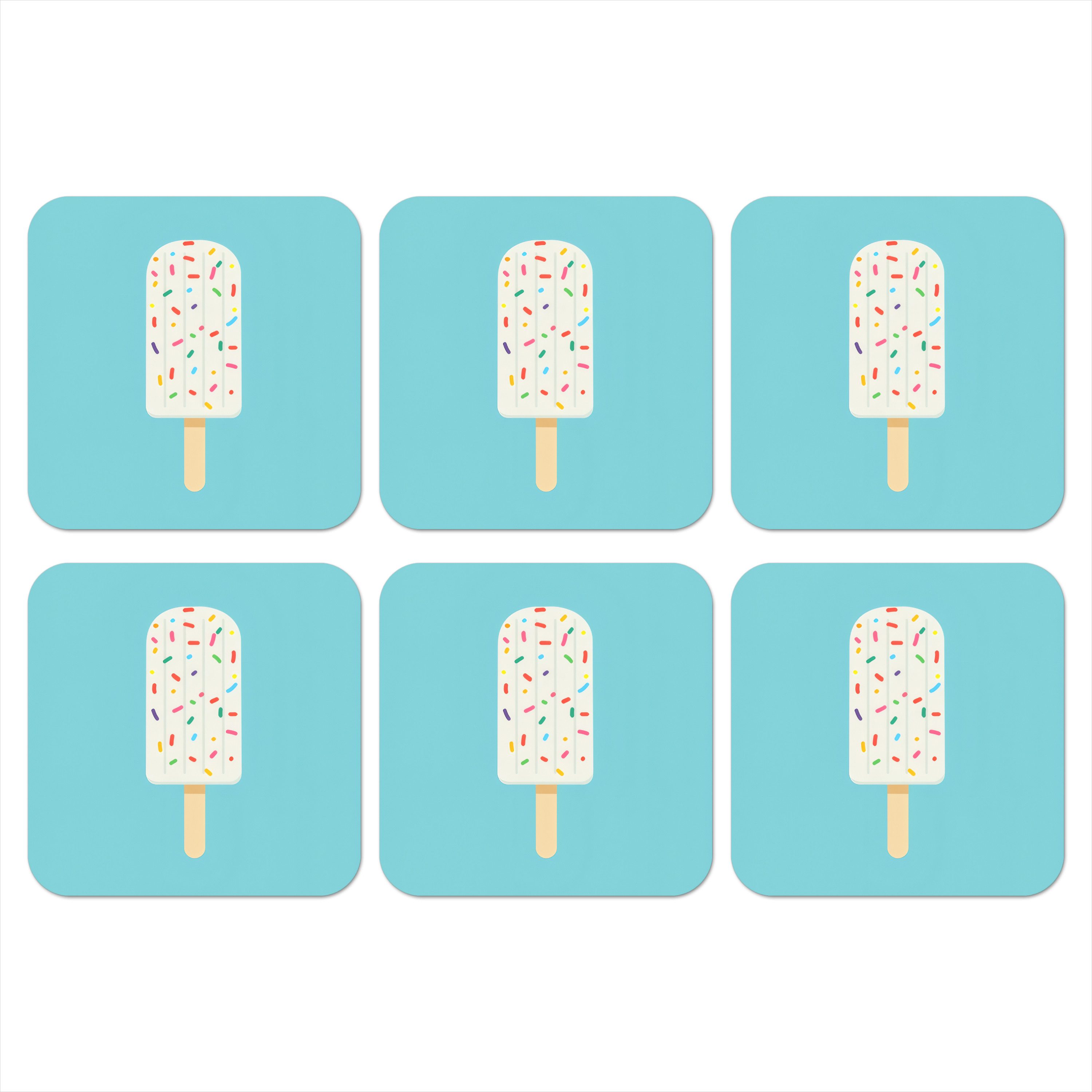 Ein weißes Eis am Holzstiel mit bunten Streuseln vor einem schlichten hellblauen Hintergrund.