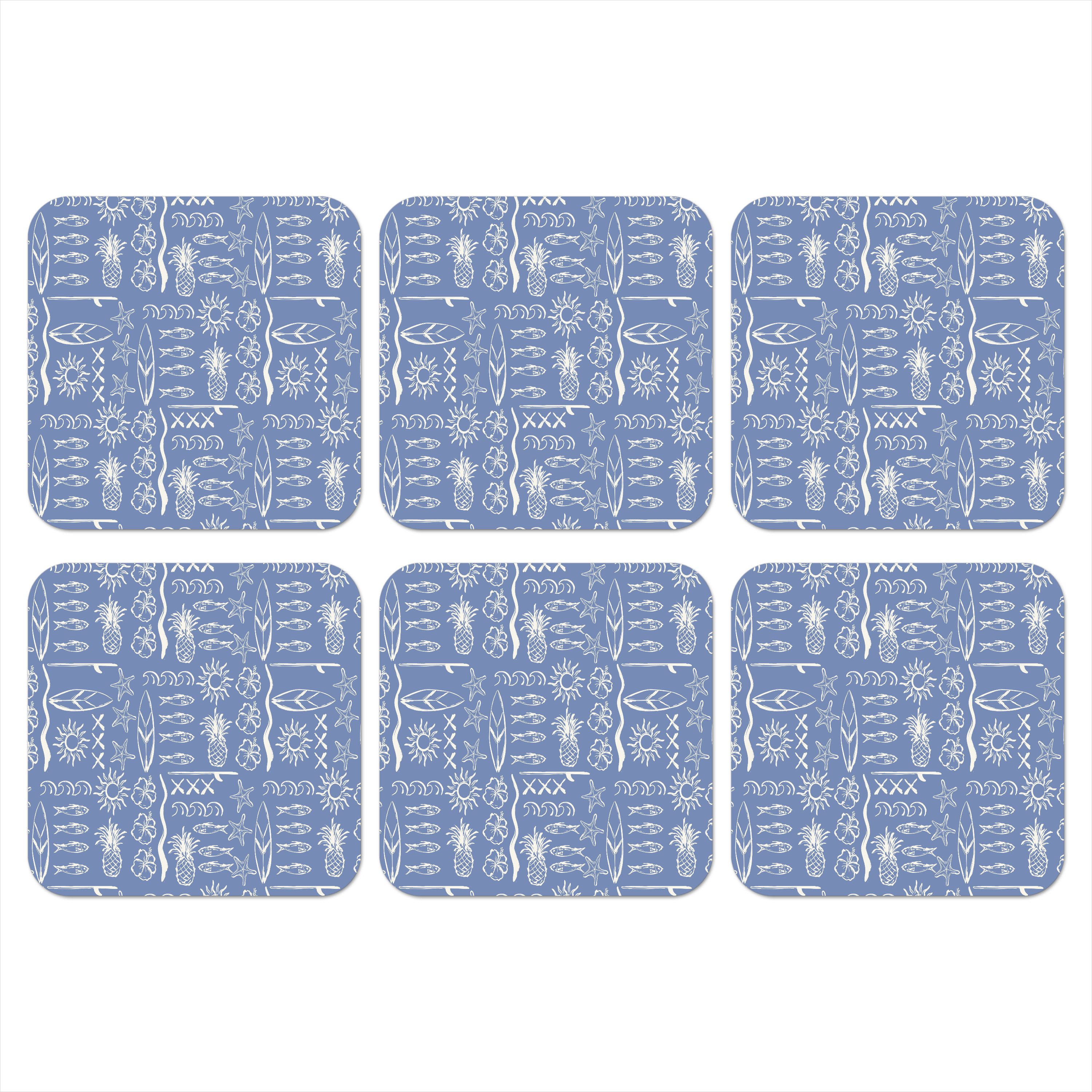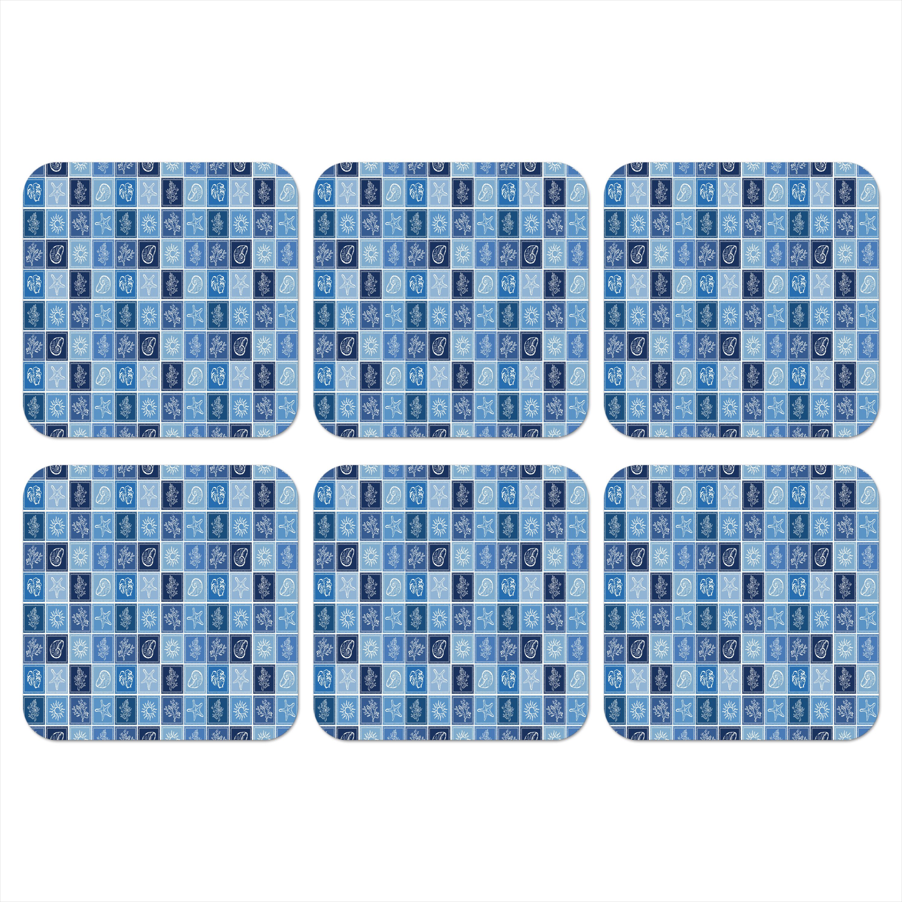 Sich wiederholendes Muster aus quadratischen Fliesen in verschiedenen Blautönen mit weißen Illustrationen von Meeresbewohnern, Korallen, Sonnen, Blättern und Muscheln. Jede Fliese hat einen dekorativen Rand und strahlt eine rustikale, maritime Atmosphäre aus, die von einem nostalgischen Küstenstil inspiriert ist.