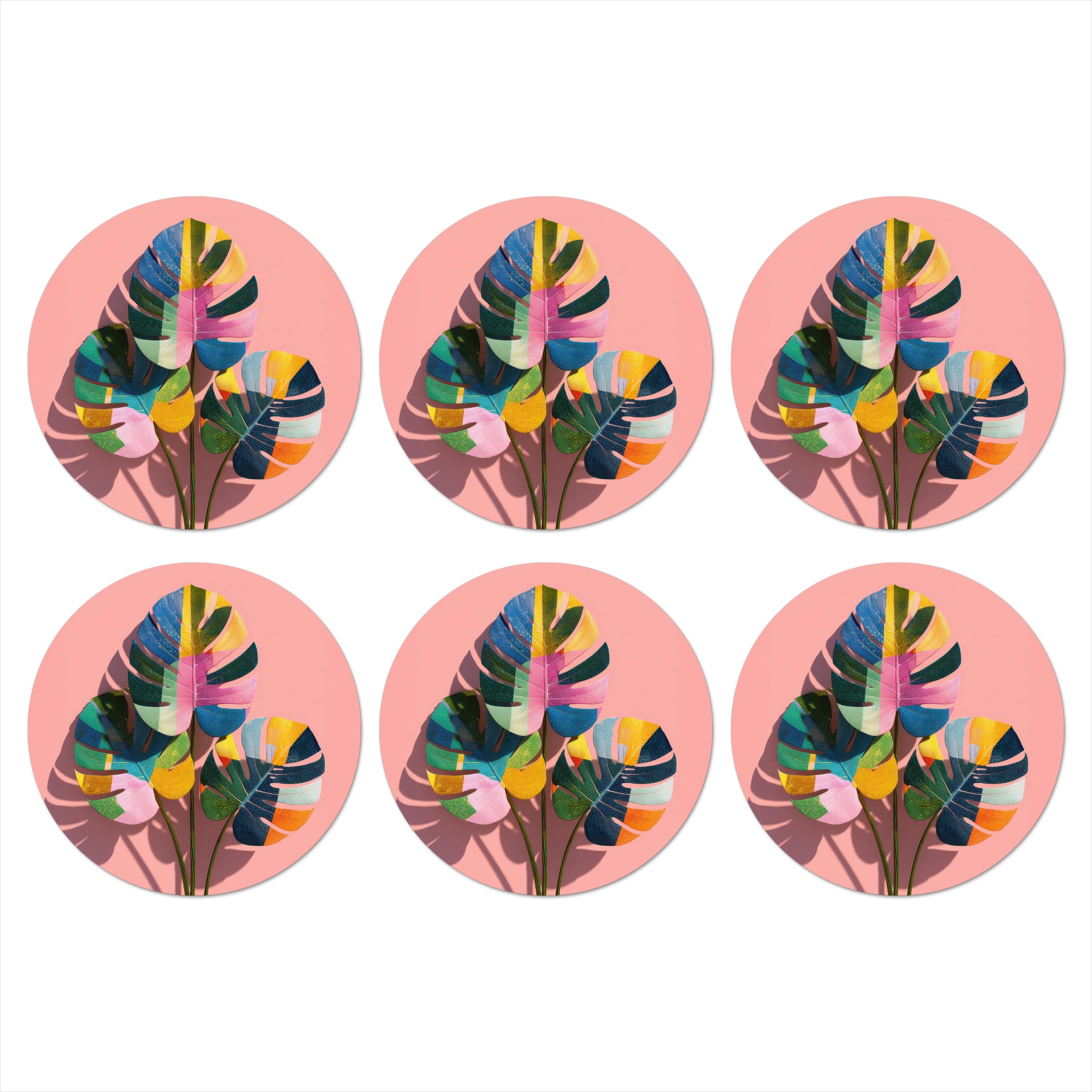 Drei Monstera-ähnliche Blätter sind in leuchtenden Farbfeldern aus Rosa, Blau, Gelb und Grün gemalt. Der rosa Hintergrund unterstreicht die fröhliche Komposition.