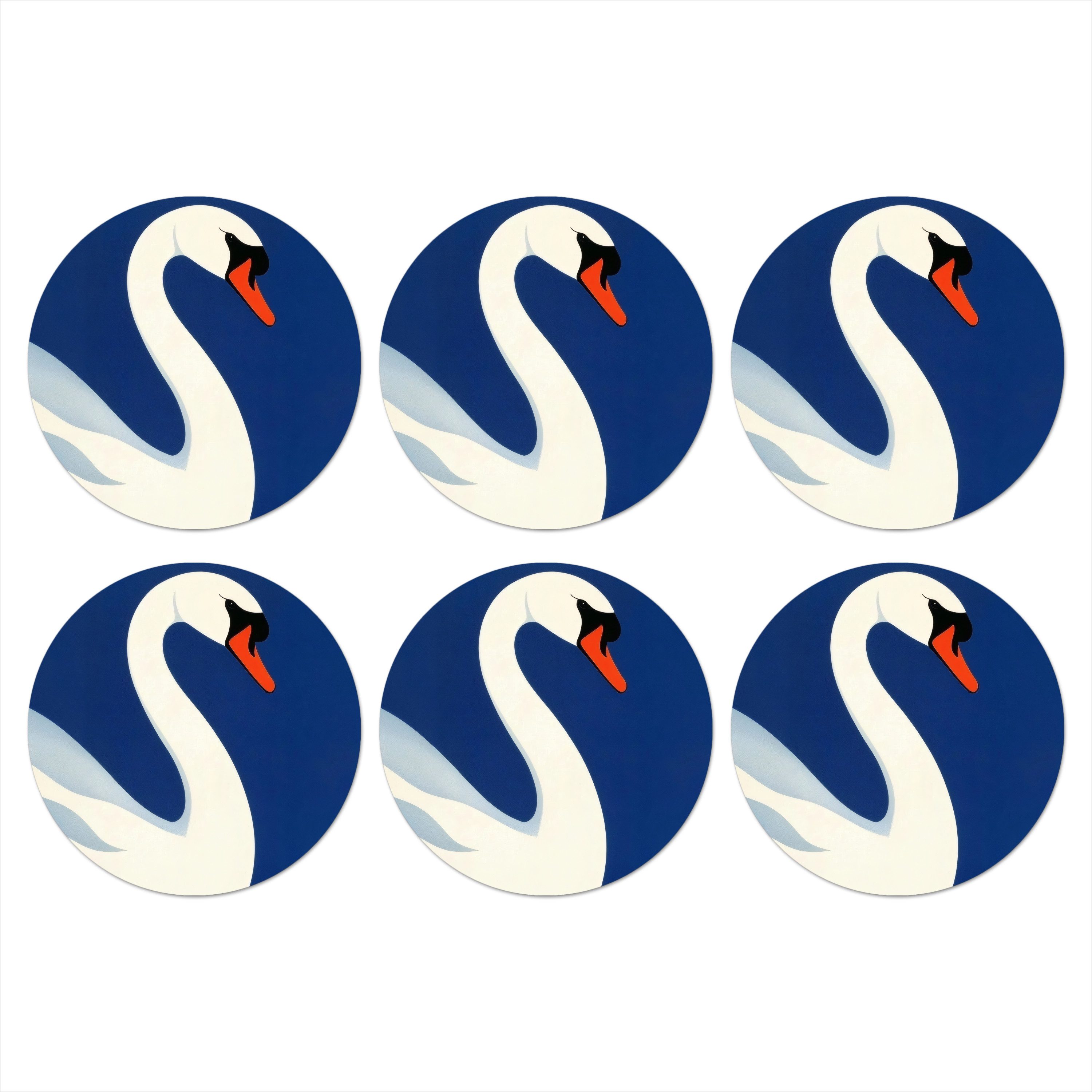 Ein weißer Schwan mit orangefarbenem Schnabel und schwarzen Details blickt nach rechts auf einen gleichmäßigen dunkelblauen Hintergrund.