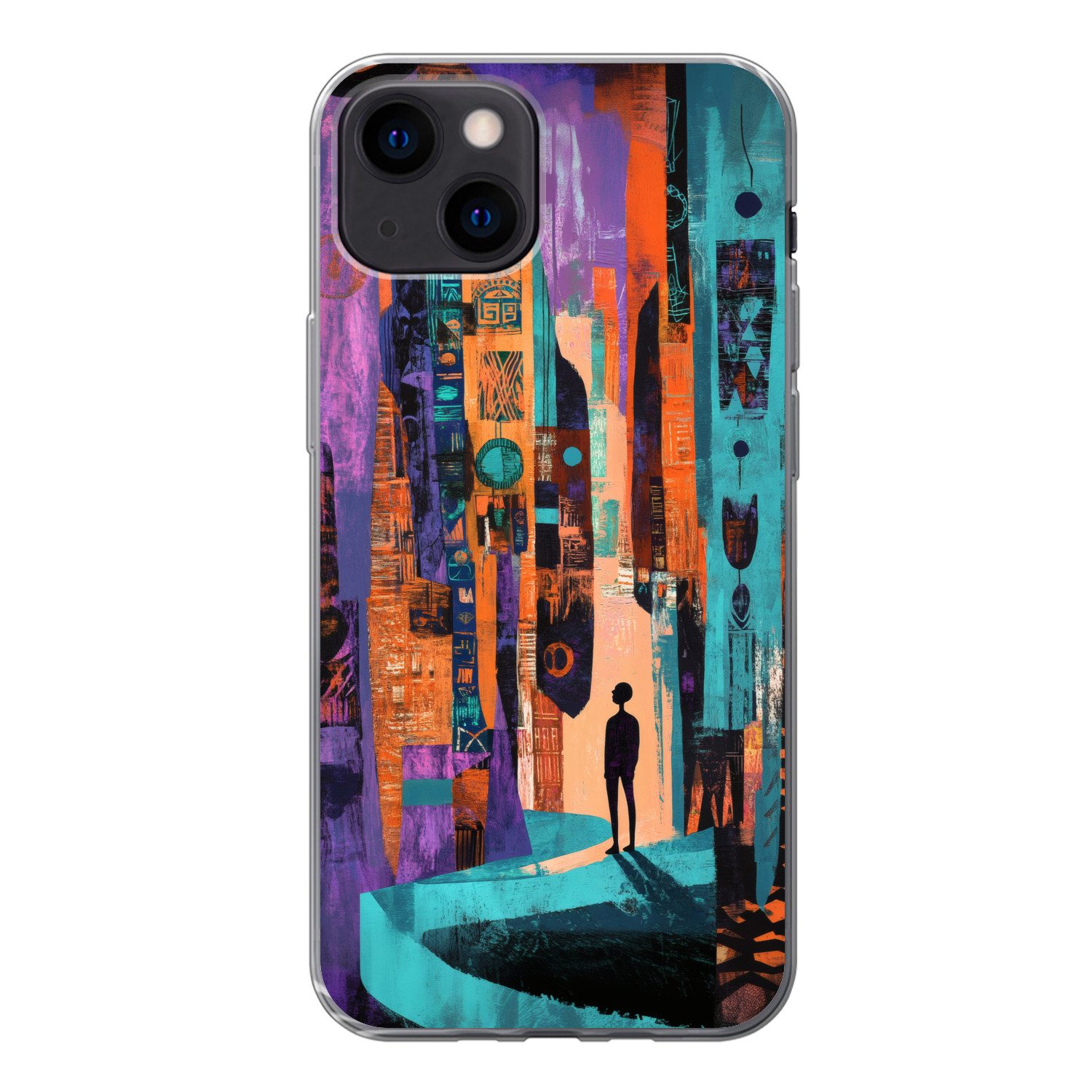 Die Silhouette einer Figur in einer fantasievollen Stadtlandschaft voller bunter abstrakter Gebäude und Symbole. Die Farben Orange, Lila und Türkis dominieren die Szene.