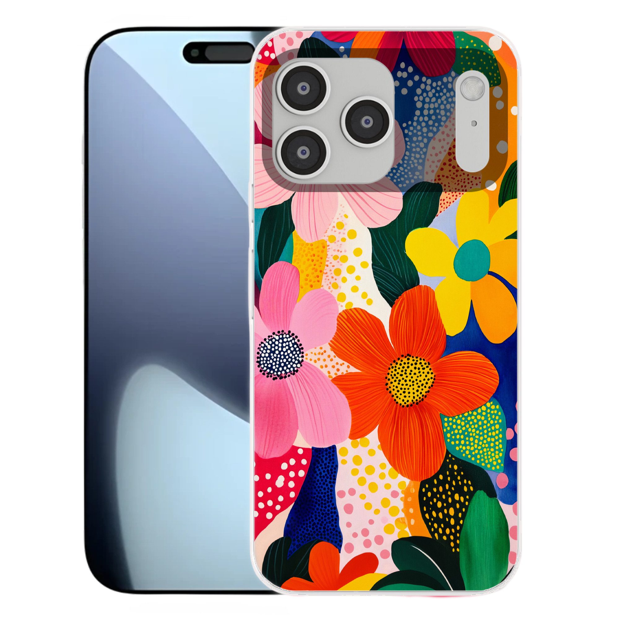 Blumen in leuchtenden Farben wie Rot, Rosa, Gelb und Orange, die über einen tiefblauen Hintergrund verstreut sind. Details in Form von Blättern und Mustern sorgen für eine lebendige Note.