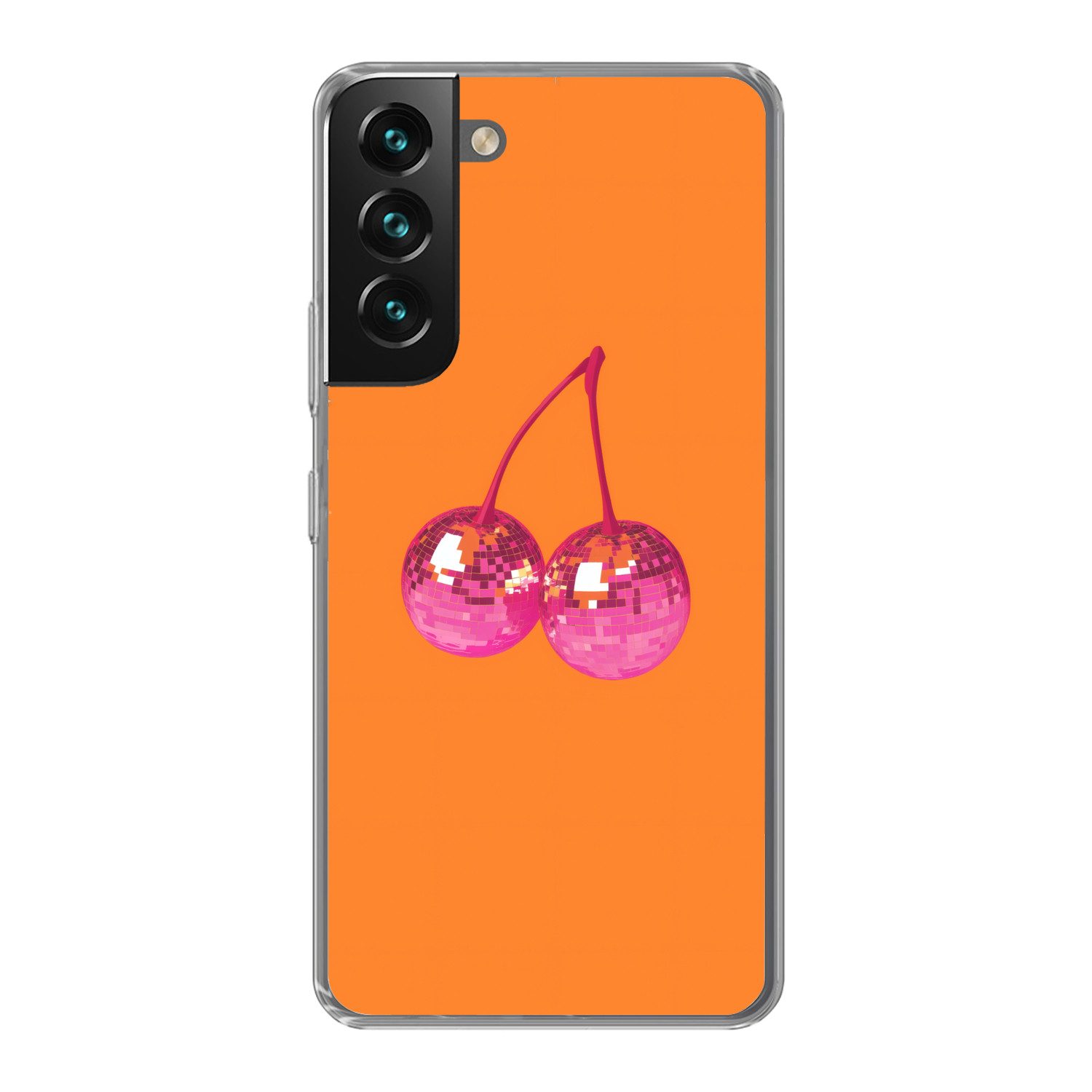 Zwei glänzende rosa Discokugeln bilden eine Kirsche mit orangefarbenem Hintergrund, die sich in quadratischen Spiegeln spiegelt.