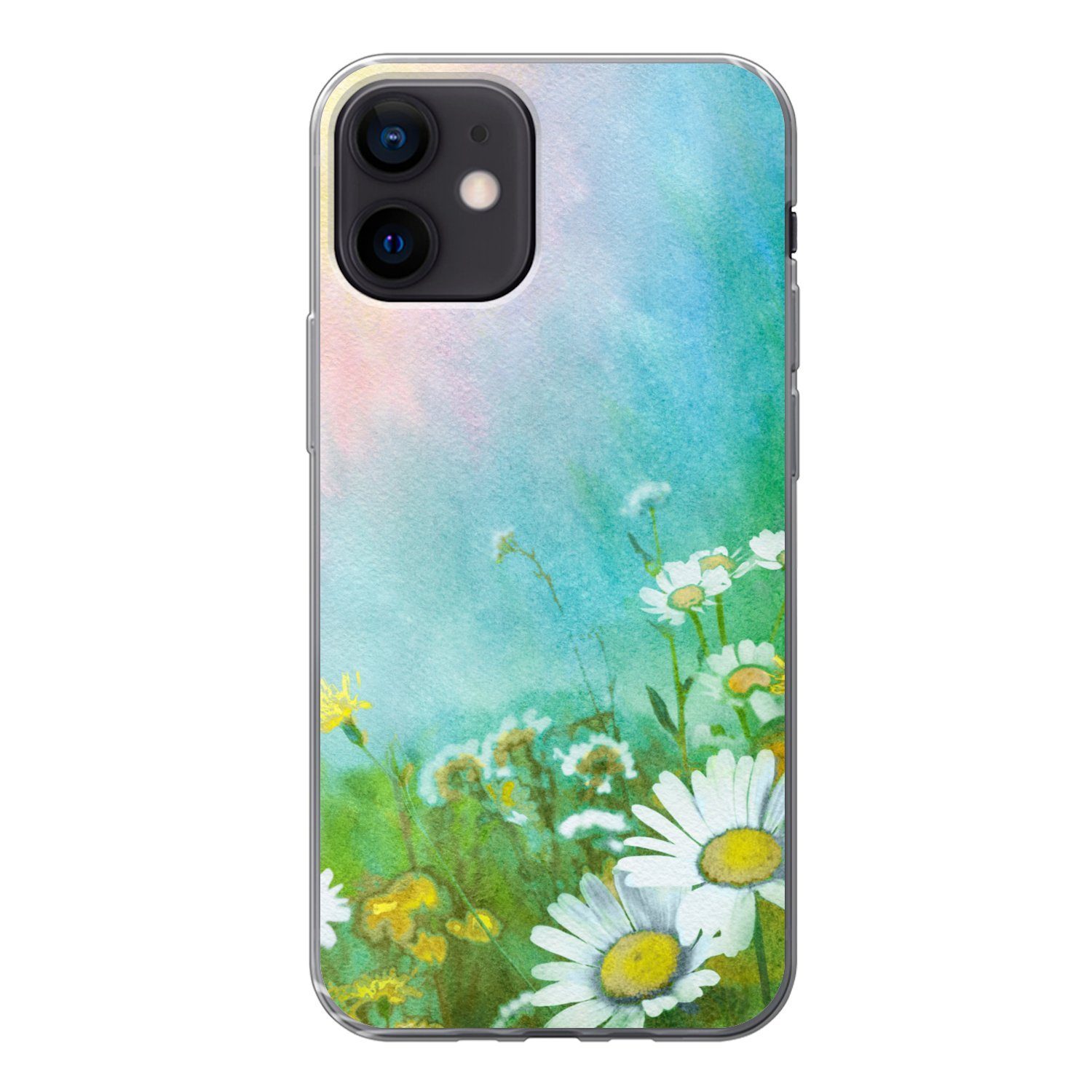 Feld mit Gänseblümchenblüten im Sommer. Die Sonne verleiht der Szene ein leichtes Glühen.Kompatible Geräte | Apple iPhone 12 |