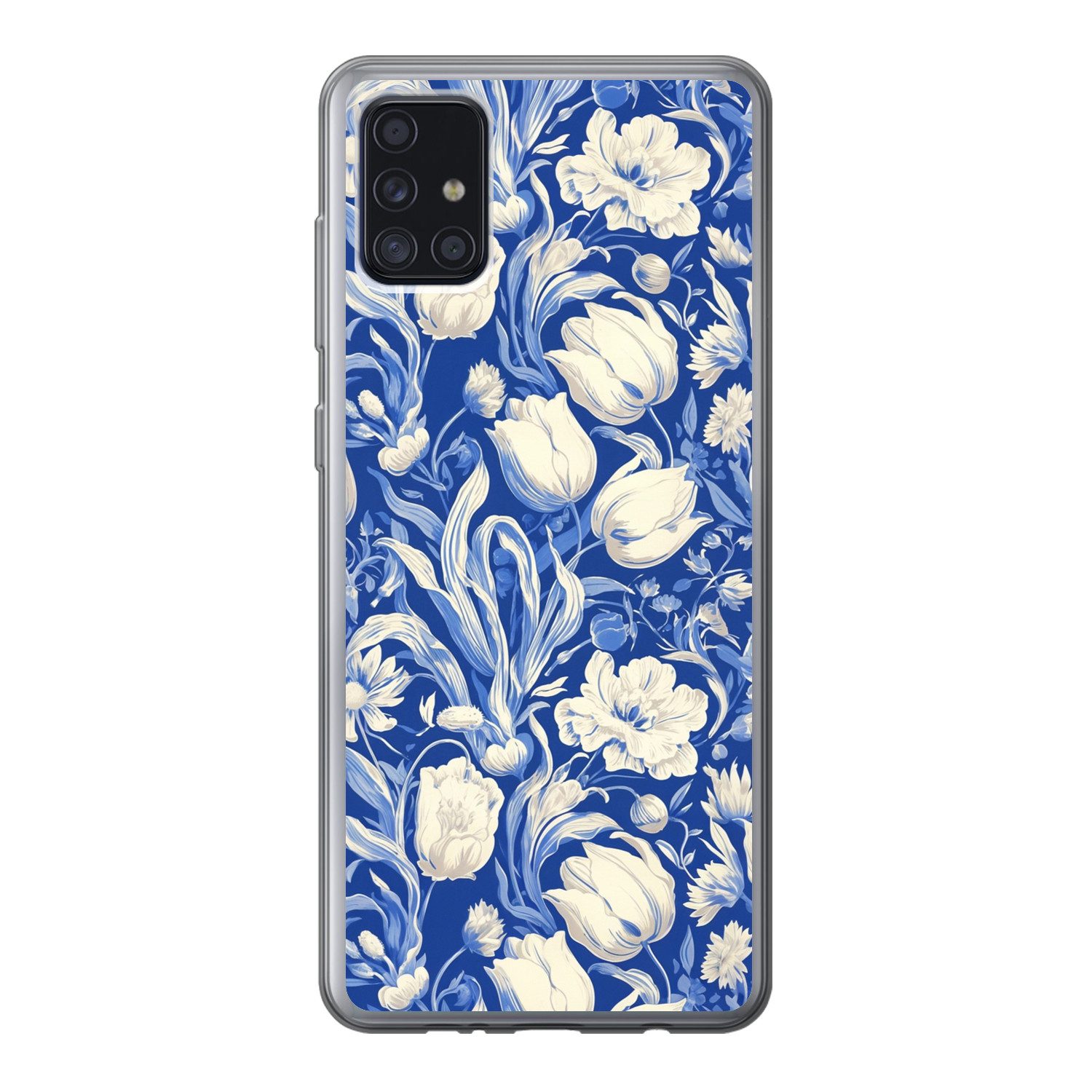 Ein detailreiches Blumenmuster im klassischen Delfter Blau-Stil mit üppigen Tulpen, Gänseblümchen und anmutigen Blättern auf einem tiefblauen Hintergrund. Die weißen floralen Akzente bilden einen eleganten Kontrast, während die fließenden Linien und natürlichen Formen dem Muster einen dynamischen und raffinierten Charakter verleihen.