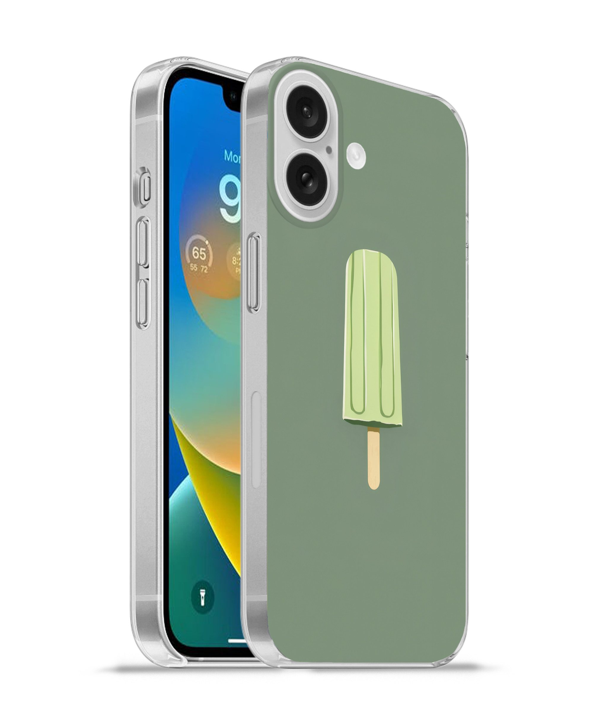 Elegant gezeichnetes grünes Wassereis am Stiel vor einem gleichmäßigen dunkelgrünen Hintergrund.