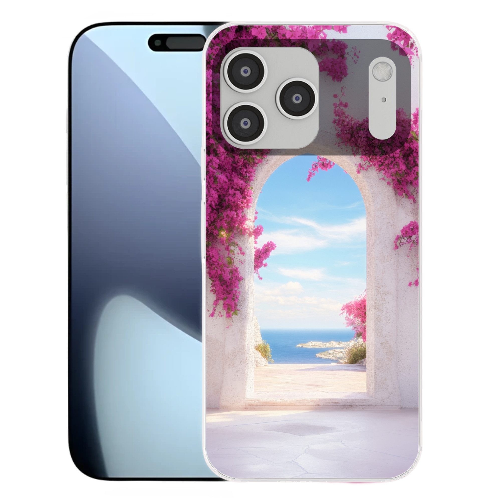 Ein eleganter weißer Torbogen, geschmückt mit üppiger Bougainvillea in leuchtendem Rosa, gibt den Blick frei auf das azurblaue Meer. In der Ferne glitzern kleine Inseln unter einem klaren Himmel. Das Sonnenlicht wirft einen sanften Schein auf den Steinboden und sorgt für eine warme und idyllische Atmosphäre.