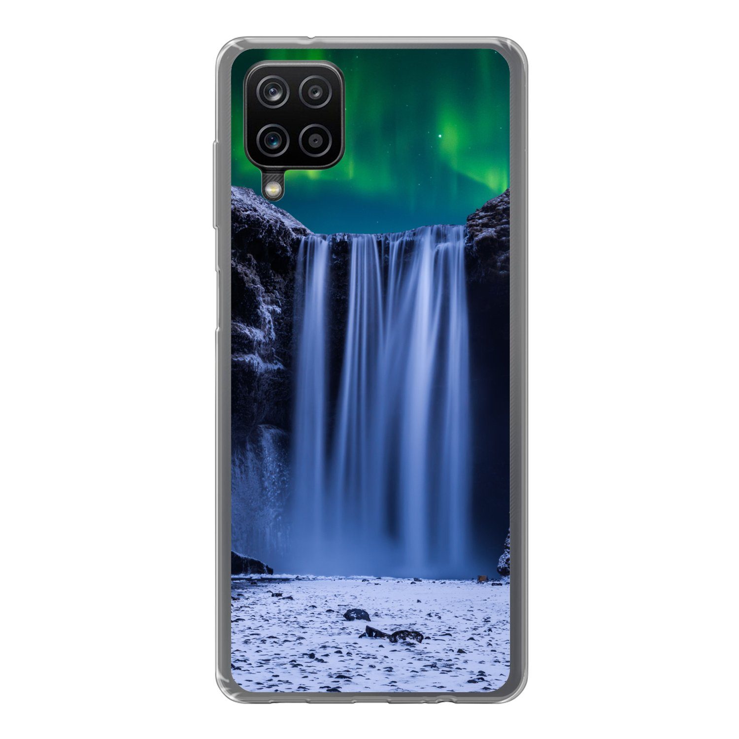 Ein Wasserfall fließt durch die schneebedeckte Natur von Island. Über dem Wasserfall hängen die Nordlichter in der Luft.Kompatible Geräte | Samsung Galaxy A12 |