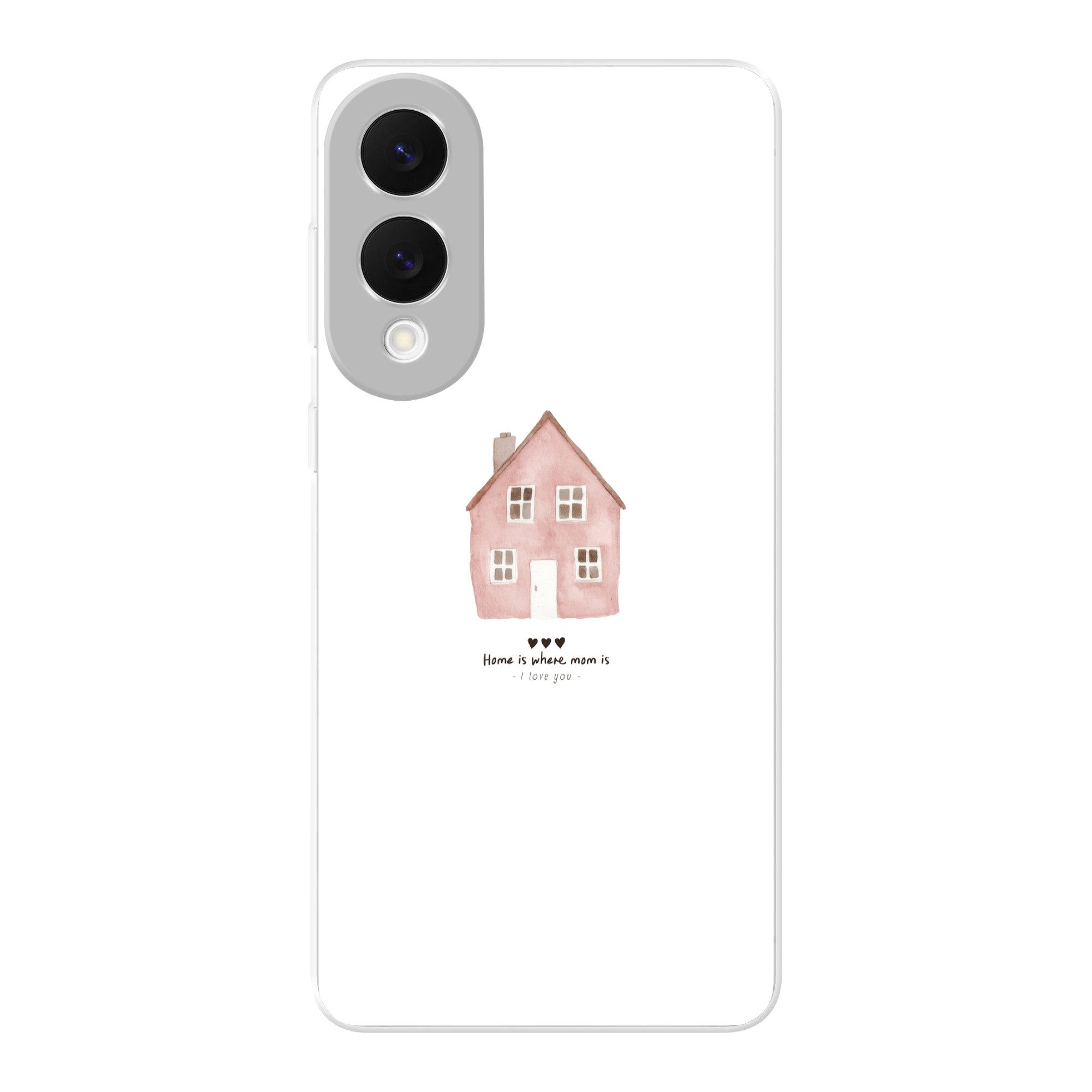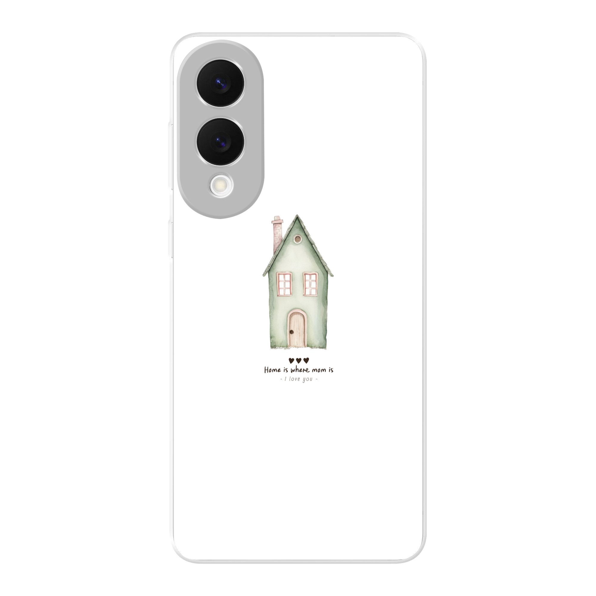 Ein schlankes grünes Haus mit Fenstern und einer Tür, darunter die Aufschrift "Home is where mom is - I love you".