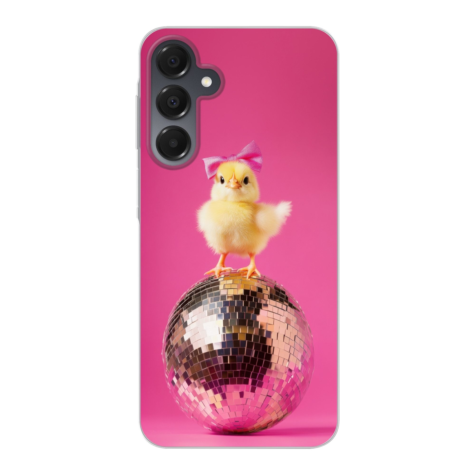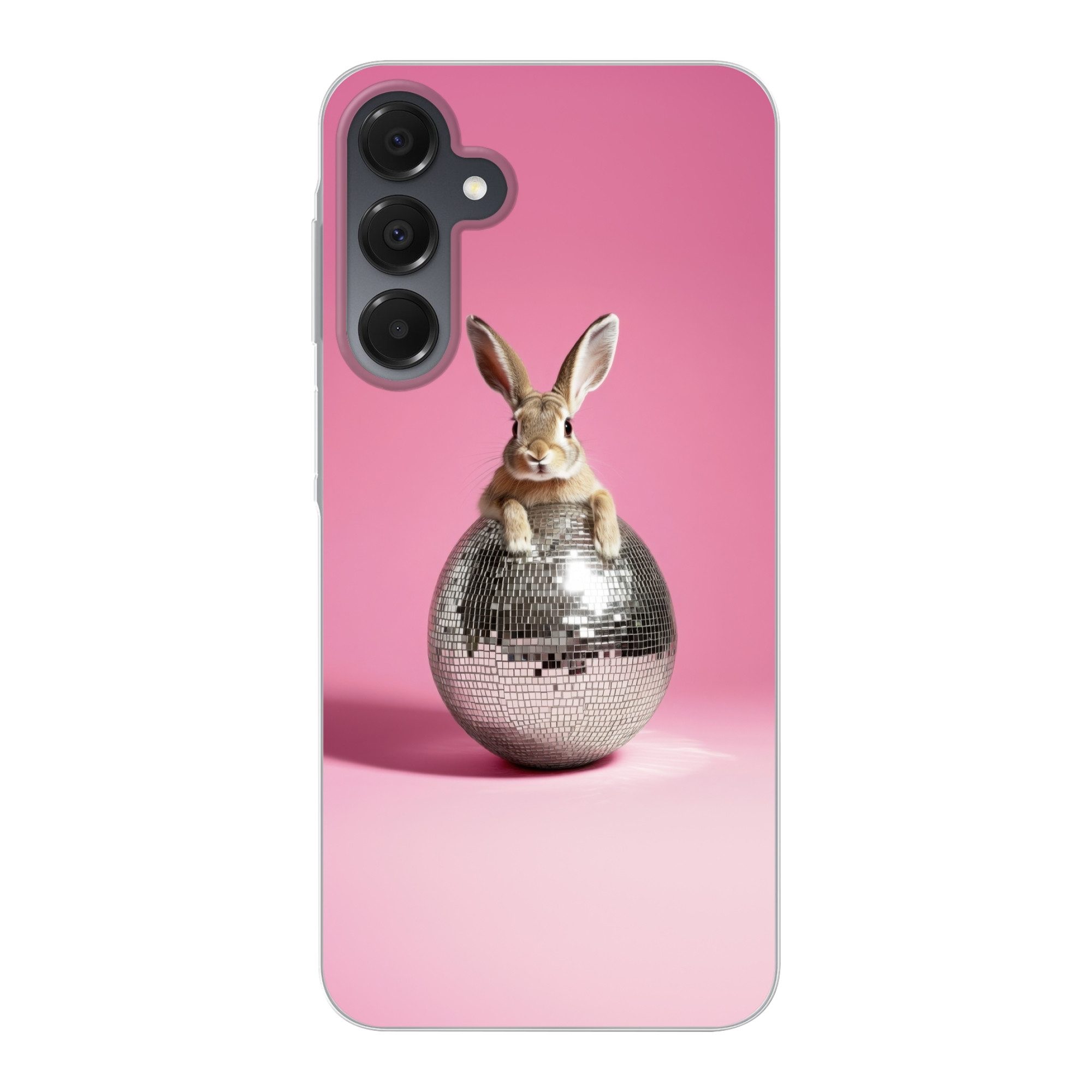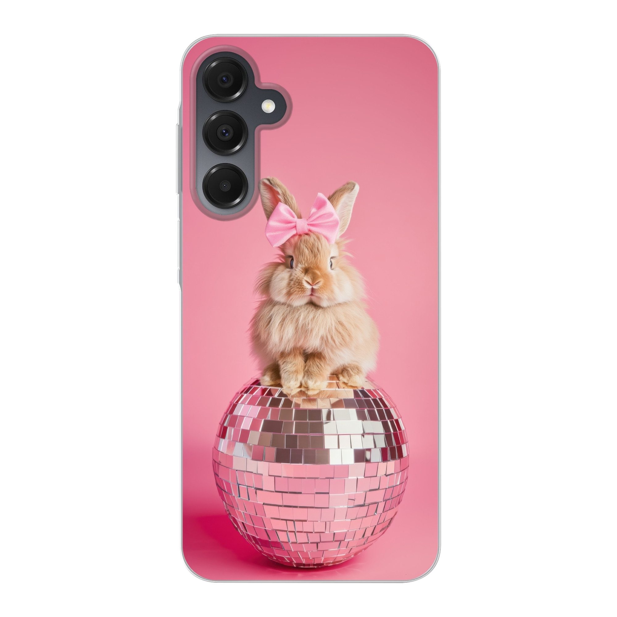Ein realistischer Hase balanciert spielerisch auf einer verspiegelten Discokugel. Die funkelnden Details und der rosafarbene Hintergrund verleihen dem Bild eine einzigartige und festliche Note.