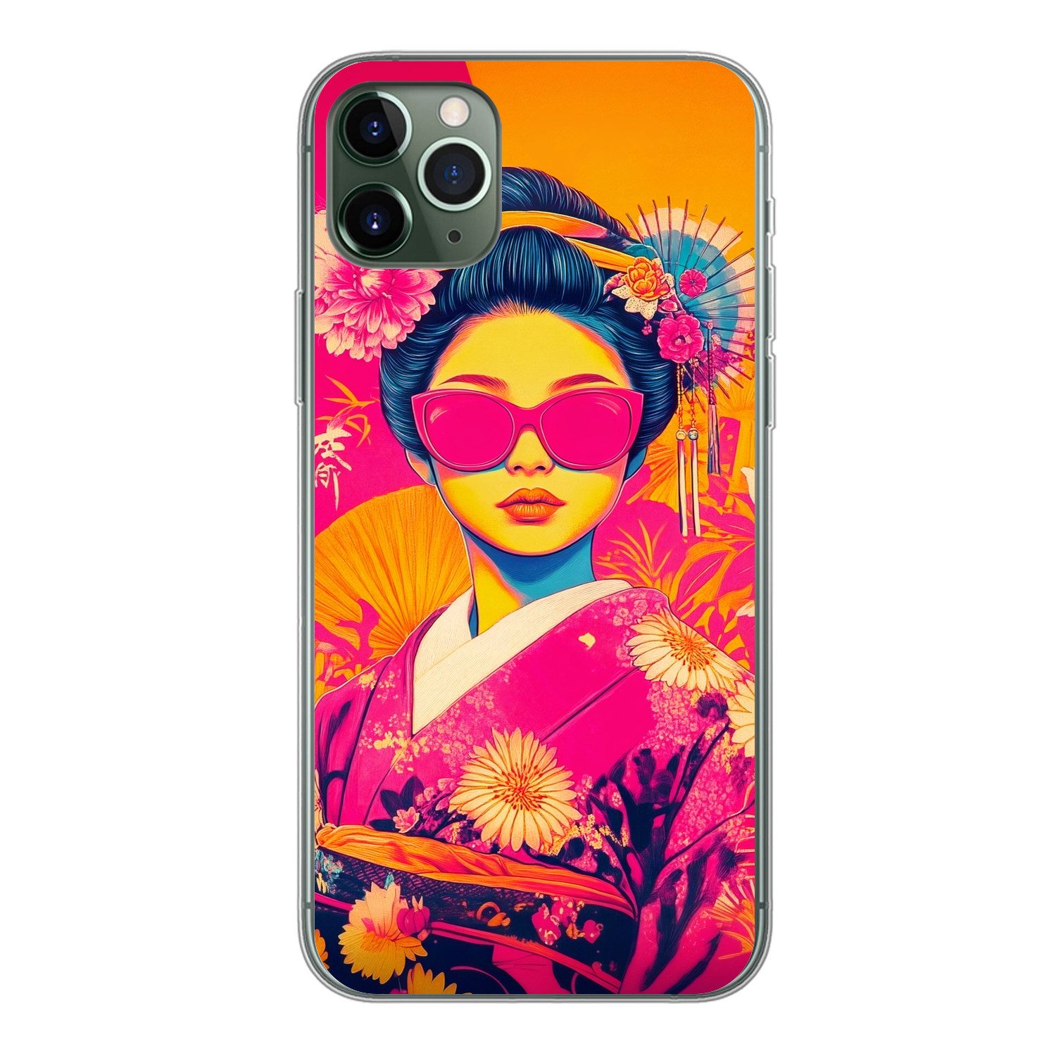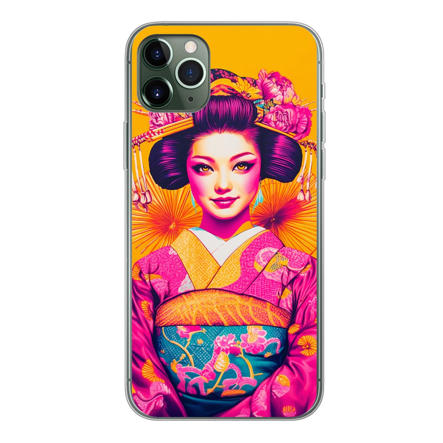 Eine junge Frau in einem rosa Kimono steht vor einer orangefarbenen Sonne mit Fächern und Zweigen im Hintergrund. Ihre Frisur ist mit Blumen geschmückt und ihr Gesichtsausdruck ist freundlich und gelassen.