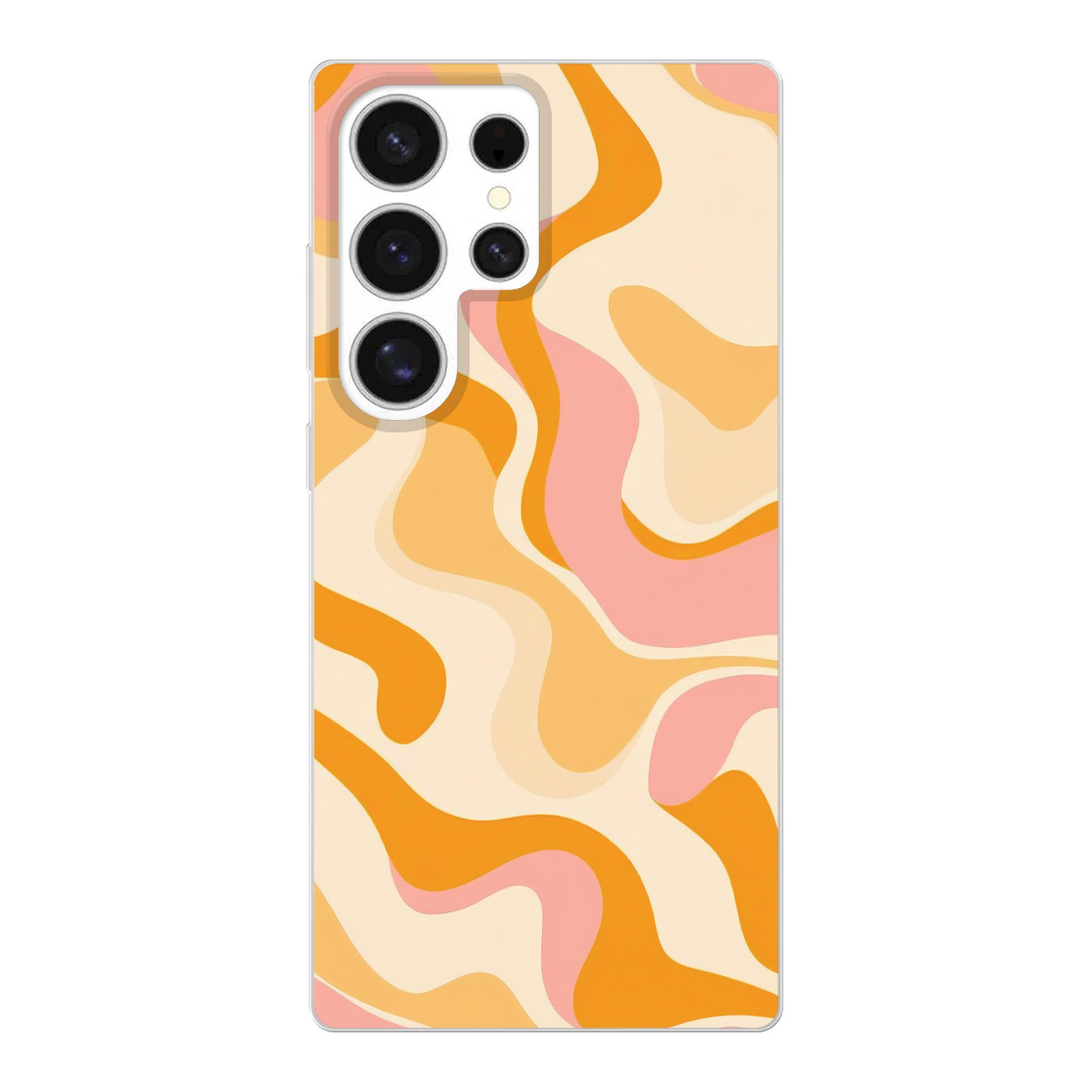 Abstrakte wellenförmige Formen in Rosa, Orange und Beige gehen ineinander über. Die Komposition suggeriert Bewegung und Wärme, mit einem Hauch von Retro.