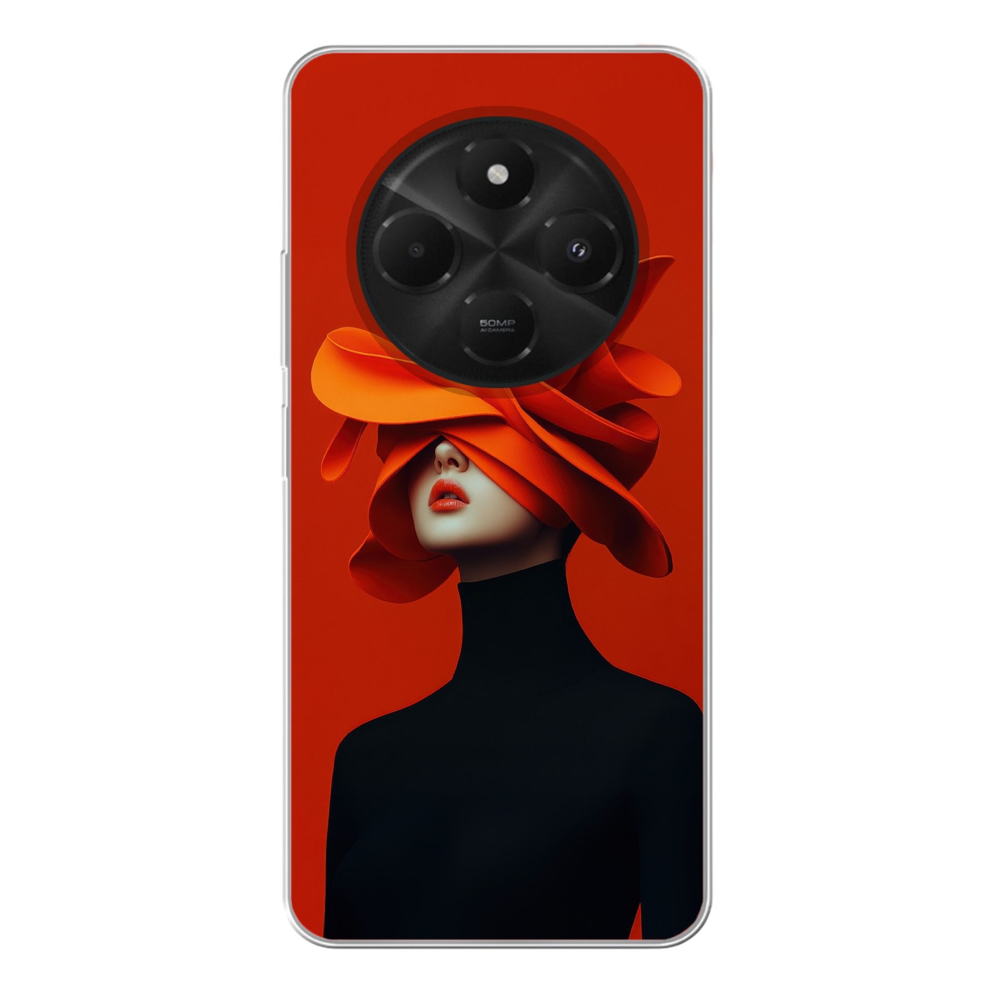 Eine Frau in schwarzem Outfit trägt einen roten Hut, der ihr wie Blütenblätter um das Gesicht fällt. Der rote Hintergrund macht das Bild besonders eindrucksvoll.
