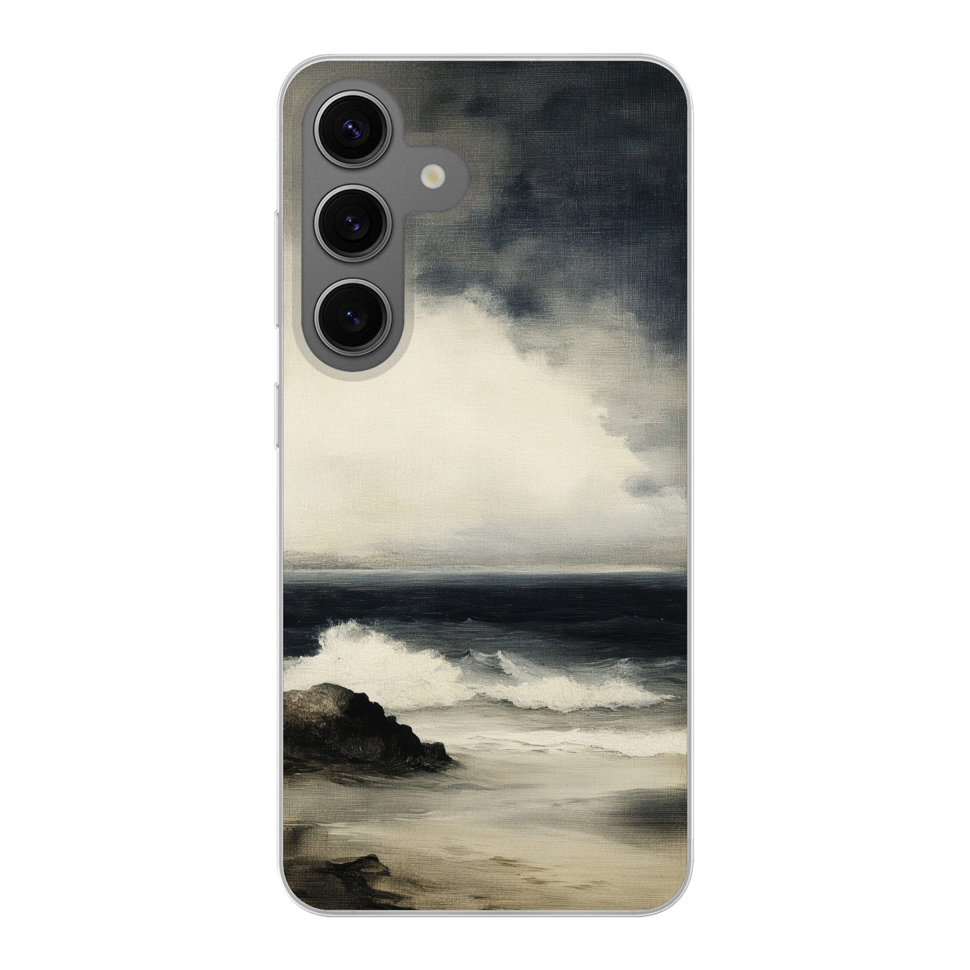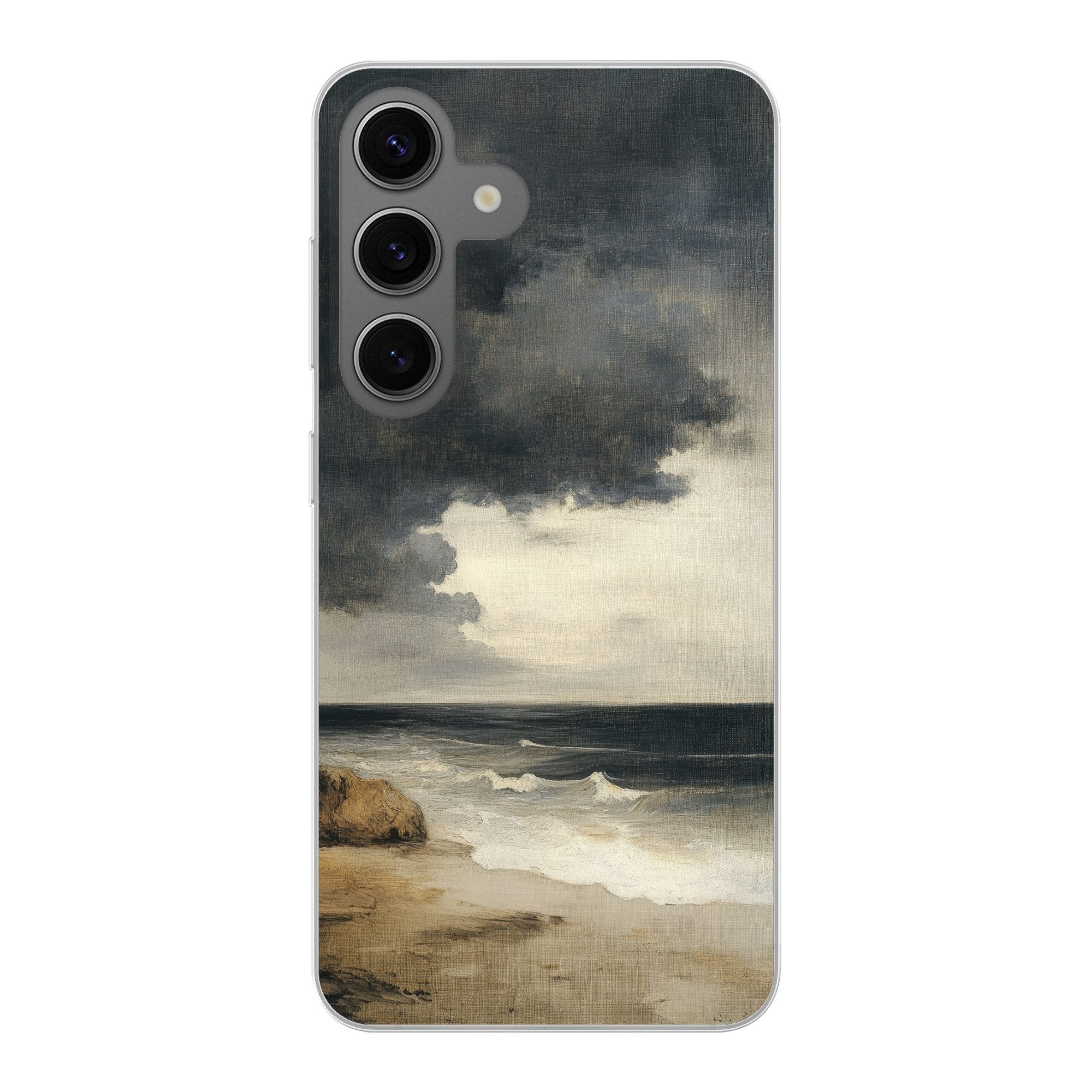 Ein schwarz-grauer Himmel beherrscht die Szene, während das kabbelige Meer seine Wellen gegen das Ufer schlägt. Ein einsamer Felsen am Strand scheint der Bedrohung durch den herannahenden Sturm standzuhalten.