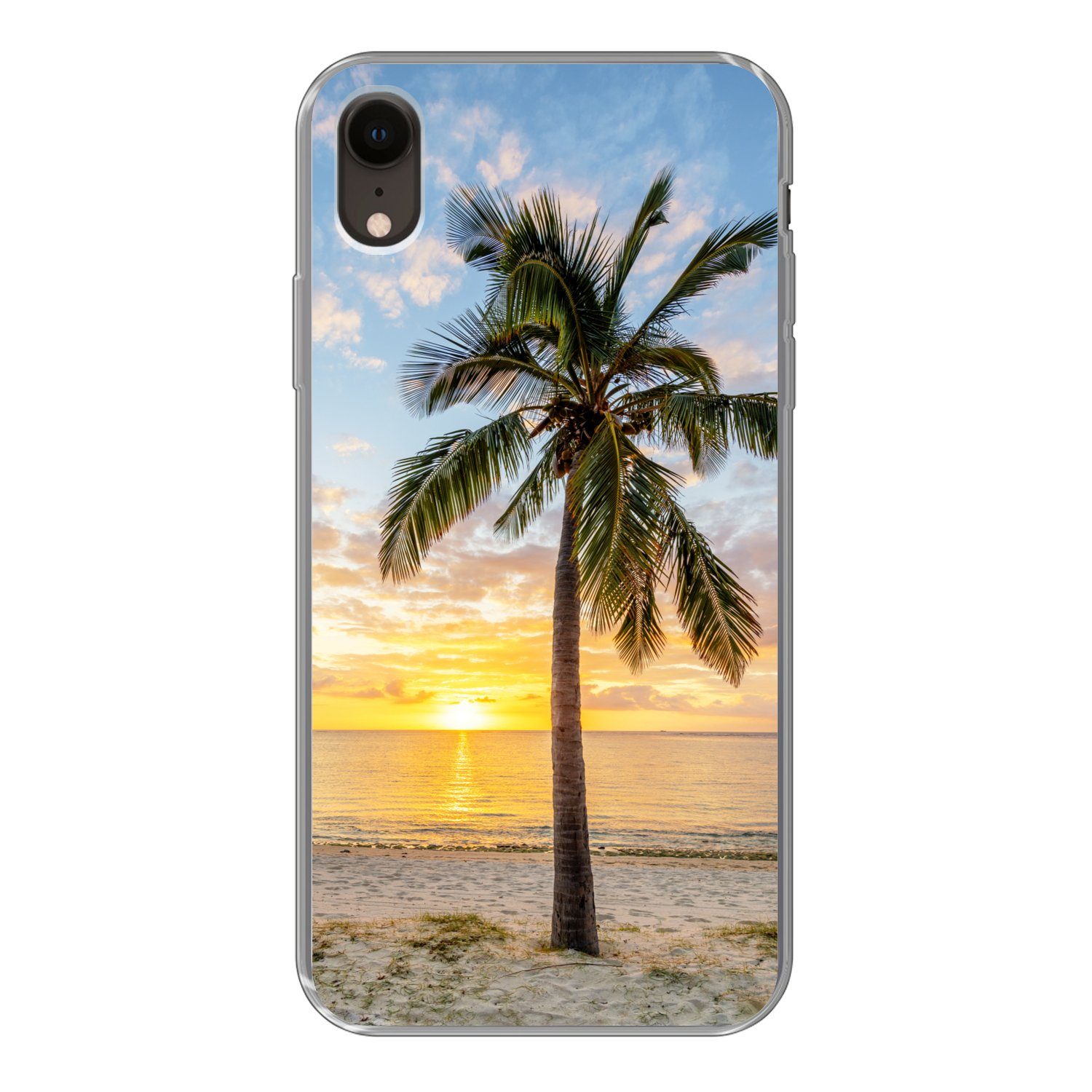 Darstellung eines tropischen Strandes in der Nähe des Meeres. Am Strand steht eine Palme. Im Hintergrund ist der Sonnenuntergang zu sehen, der Himmel färbt sich orange.Kompatible Geräte | Apple iPhone XR |