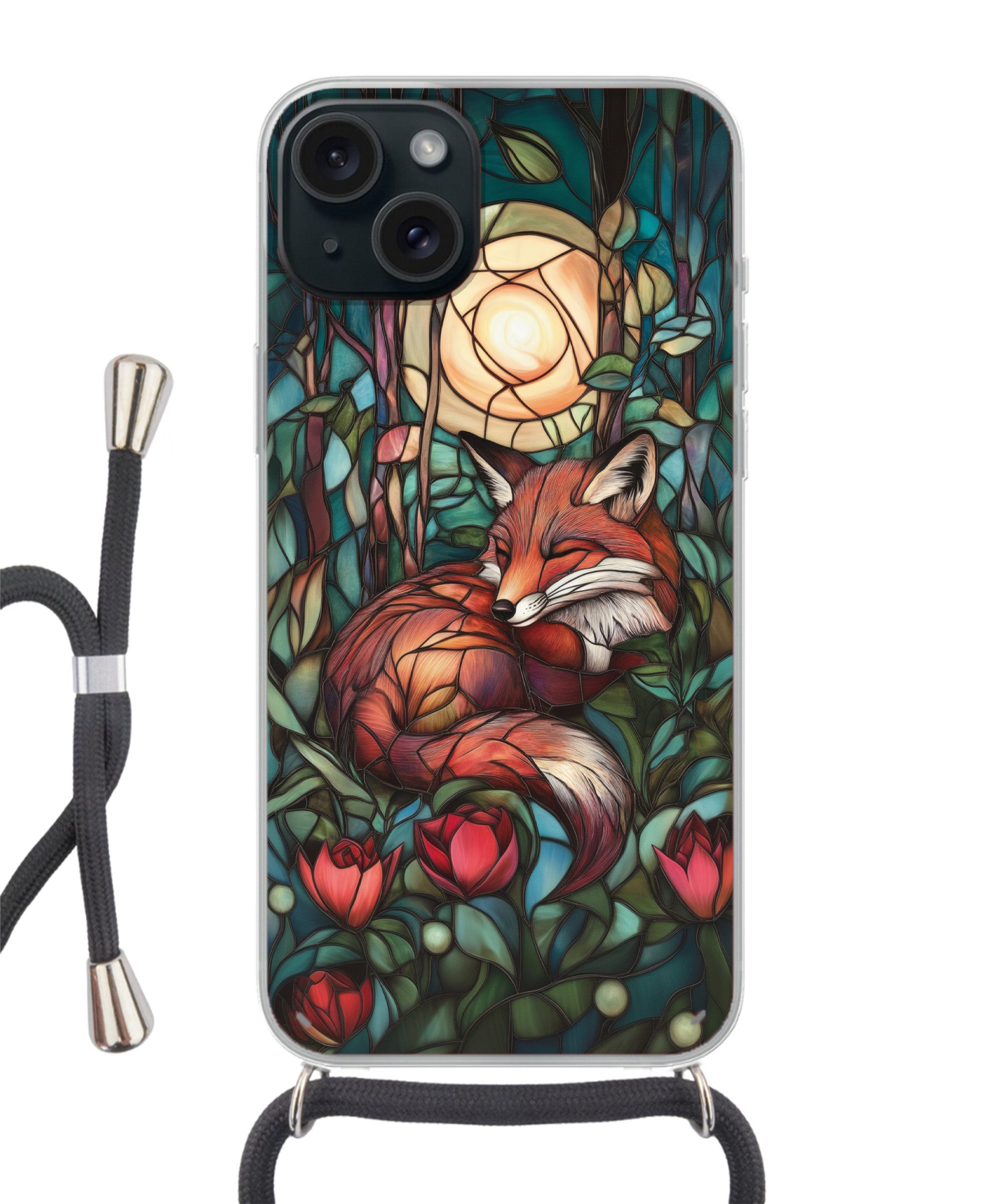 Ein Fuchs liegt zusammengerollt in einem Wald voller Blumen, Blätter und Mondlicht. Das Kunstwerk ist im Stil einer Glasmalerei mit viel Farbkontrast gestaltet.