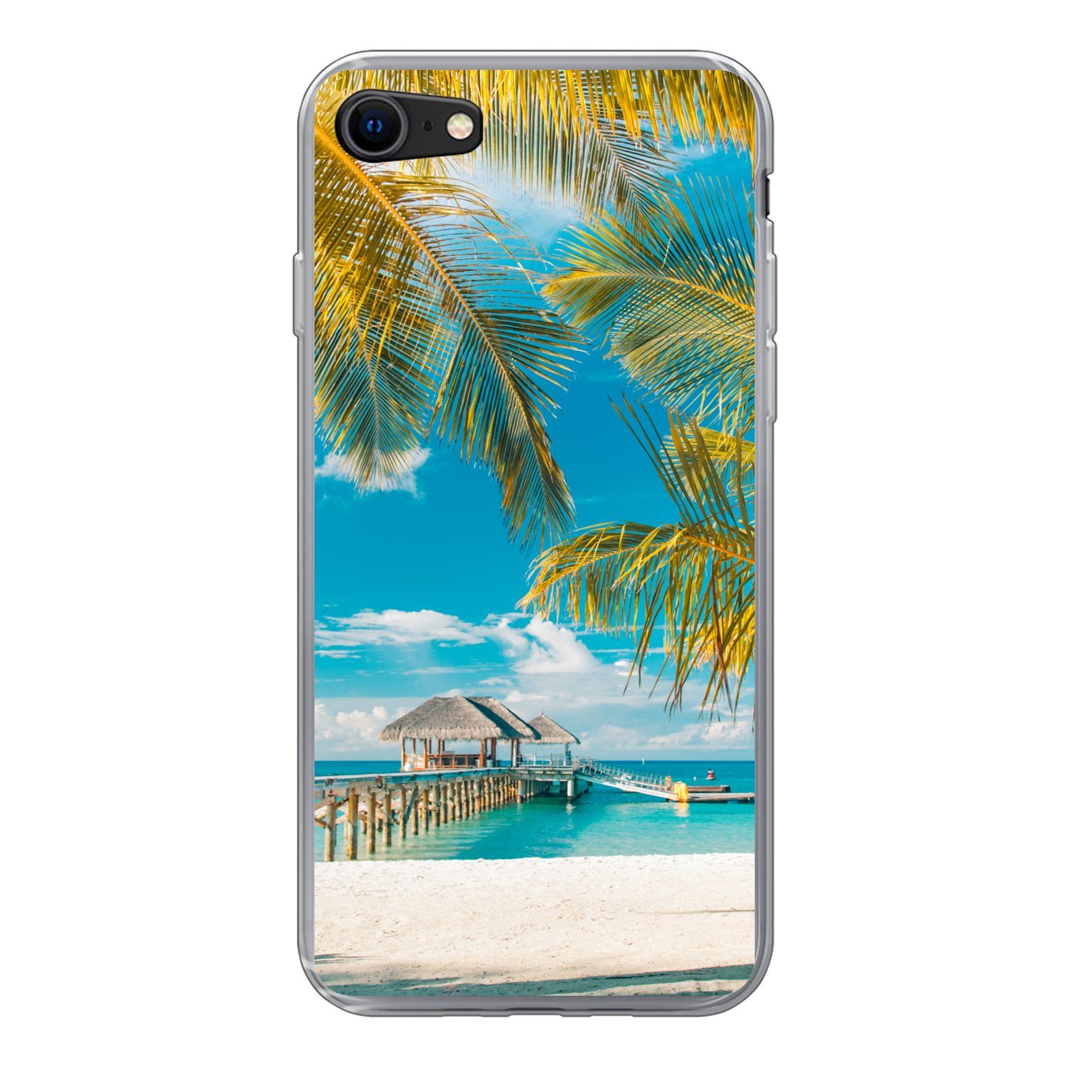 Darstellung eines tropischen Strandes in der Nähe des blauen Wassers des Meeres. Am Strand steht eine Palme, hinter dem Baum scheint die Sonne.Kompatible Geräte | Apple iPhone SE 2020 |