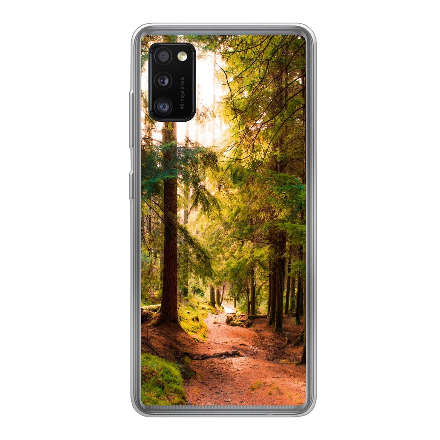 Ein typisch amerikanischer Waldweg verschwindet in der Ferne. Die Umgebung wirkt ruhig, während die Sonne langsam aufgeht.Kompatible Geräte | Samsung Galaxy A41 |