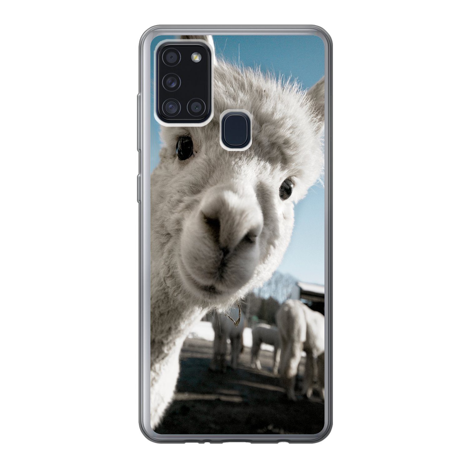 Porträt eines Alpakas mit weißer Wolle. Im Hintergrund sind weitere Tiere zu sehen.Kompatible Geräte | Samsung Galaxy A21s |