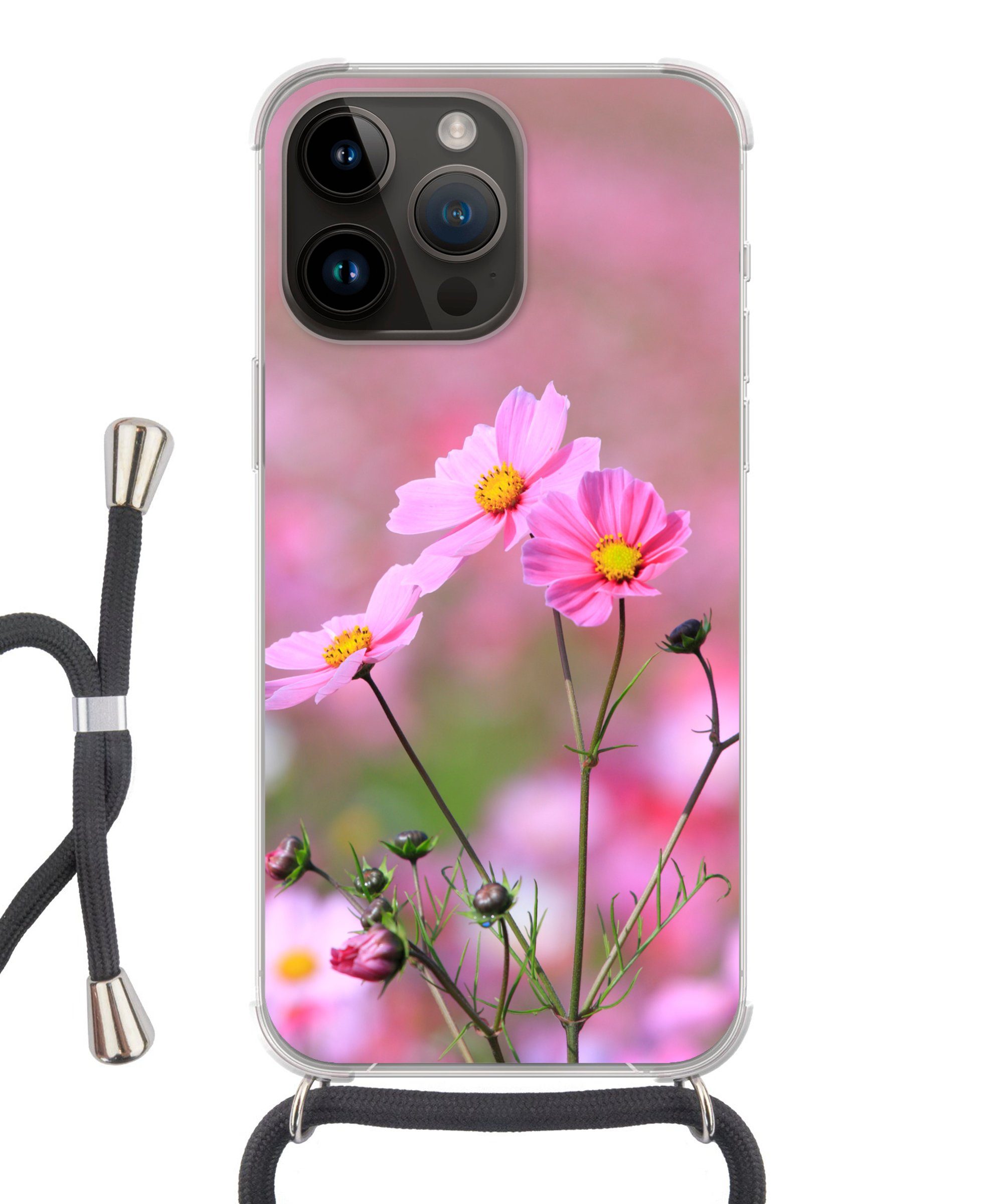 Auf diesem Feld draußen sind zahlreiche rosa Blüten zu sehen. Der Hintergrund ist unscharf, so dass die Blume im Vordergrund noch mehr hervorsticht.Kompatible Geräte | Apple iPhone 14 Pro |