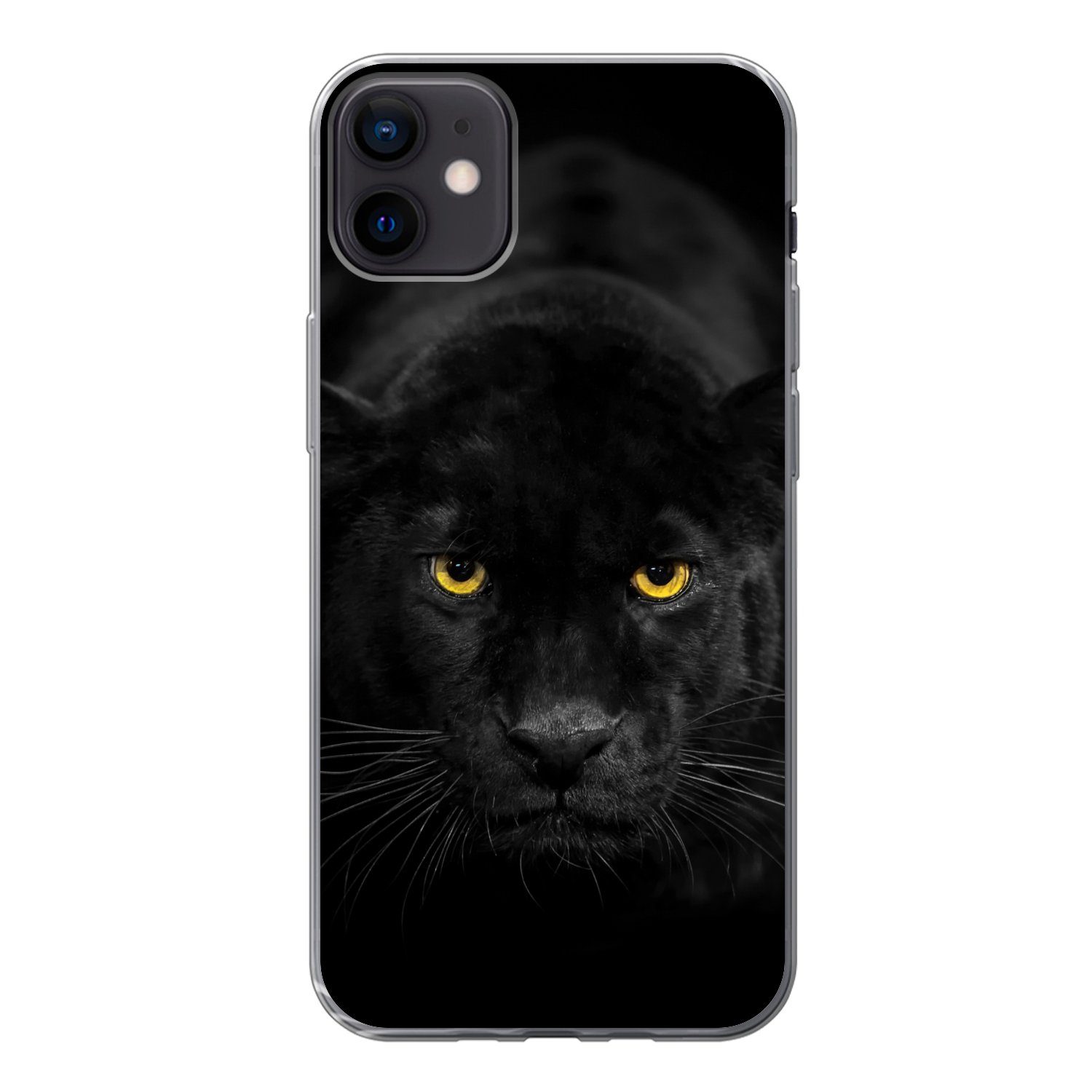 Leopard vor schwarzem Hintergrund. Das Tier hat auffällige Augen.Kompatible Geräte | Apple iPhone 12 Mini |