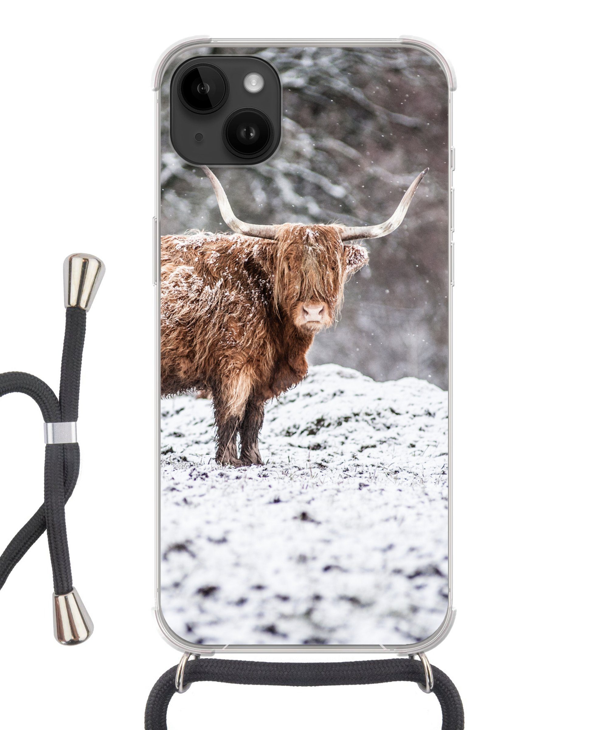 Ein schottischer Highlander steht still im Schnee. Der Schnee im Fell des Tieres zeigt an, dass es Winter ist.Kompatible Geräte | Apple iPhone 14 Plus |