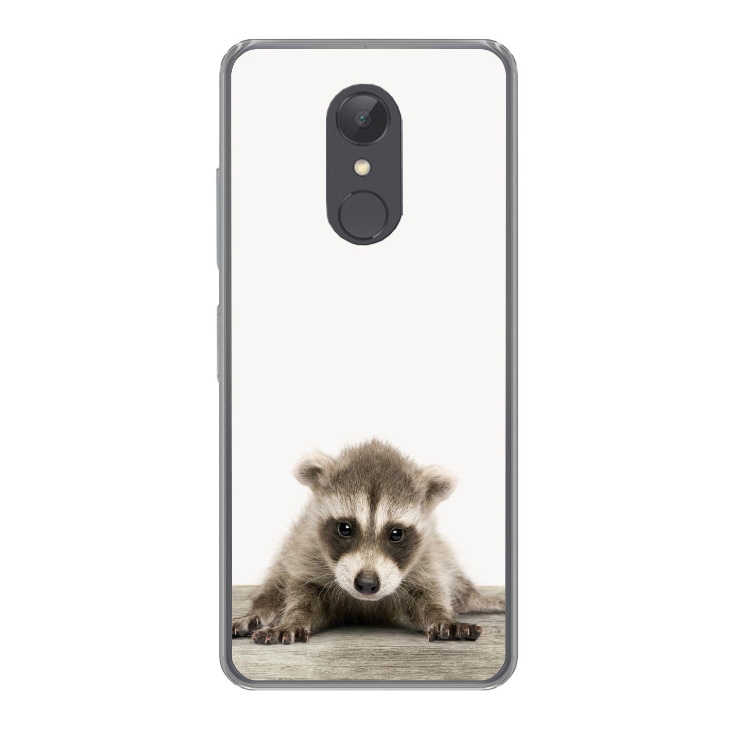 Ein junger Waschbär liegt auf einem Holzsockel.Kompatible Geräte | Xiaomi Redmi 5 |