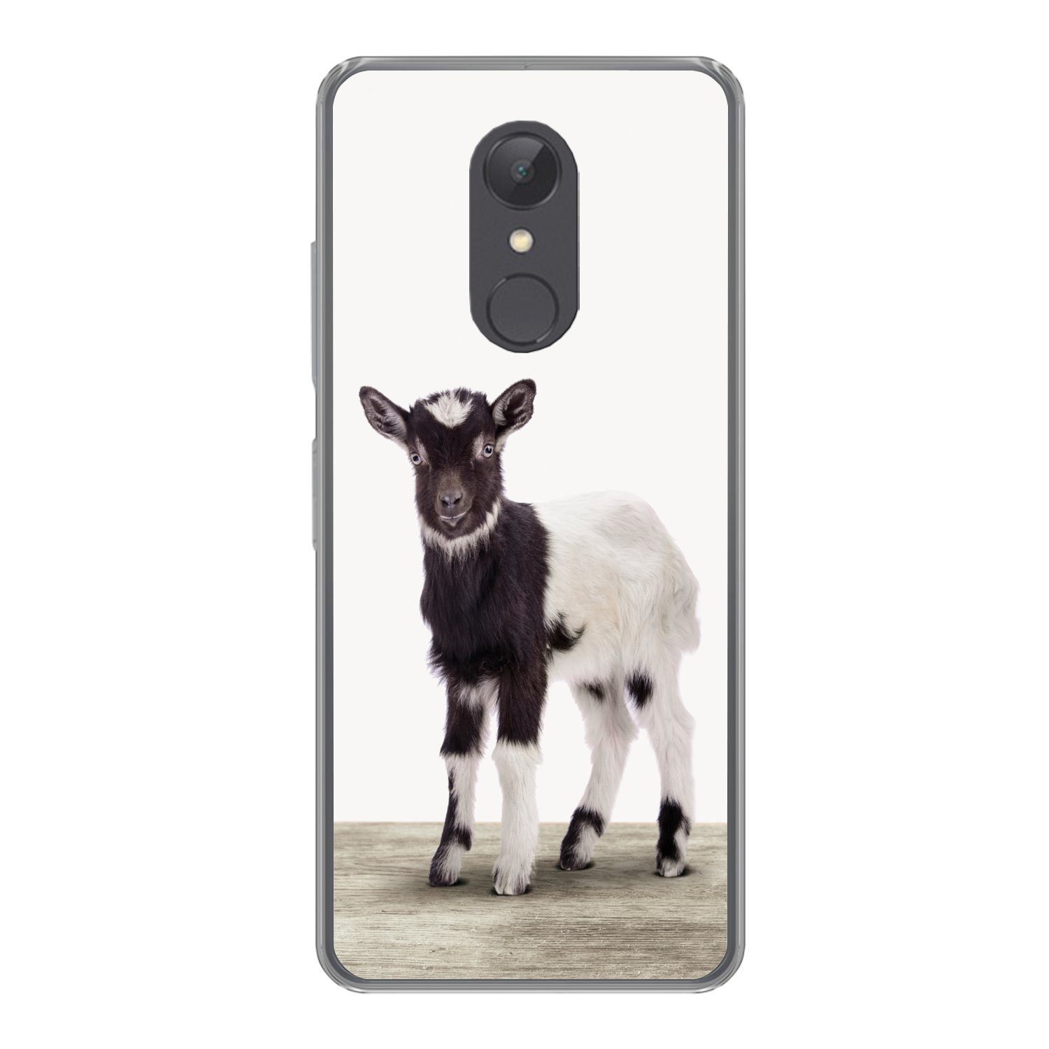 Ein Ziegenbaby steht auf einem Holzsockel und hebt sich von dem weißen Hintergrund ab. Dieses Bild ist perfekt für jedes Kinderzimmer, sei es für ein Kleinkind oder ein Vorschulkind!Kompatible Geräte | Xiaomi Redmi 5 |