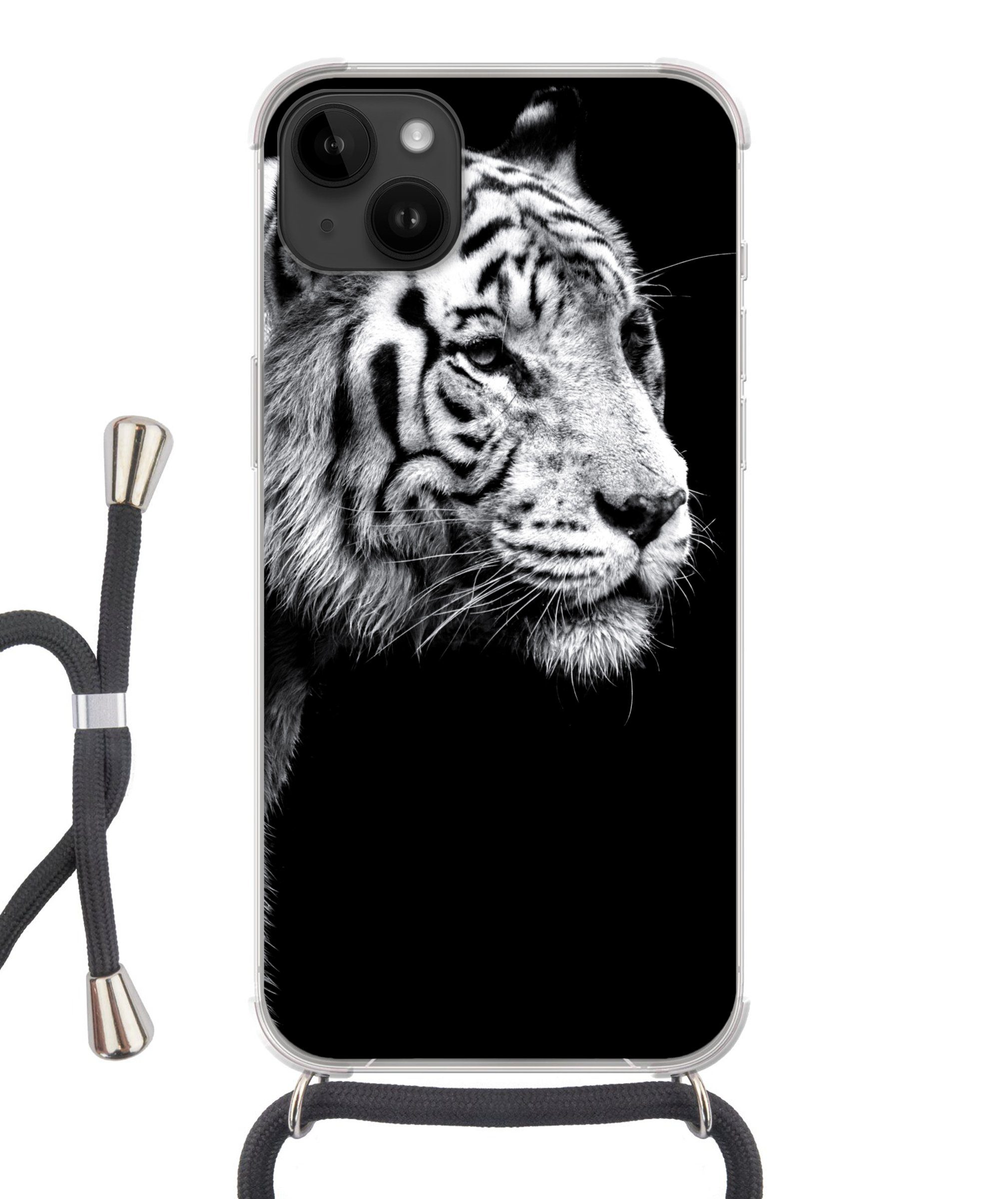 Nahaufnahme eines weißen Tigers auf schwarzem Hintergrund. Er schaut elegant nach vorne. Dieses Bild kommt im Wohnzimmer gut zur Geltung.Kompatible Geräte | Apple iPhone 14 Plus |
