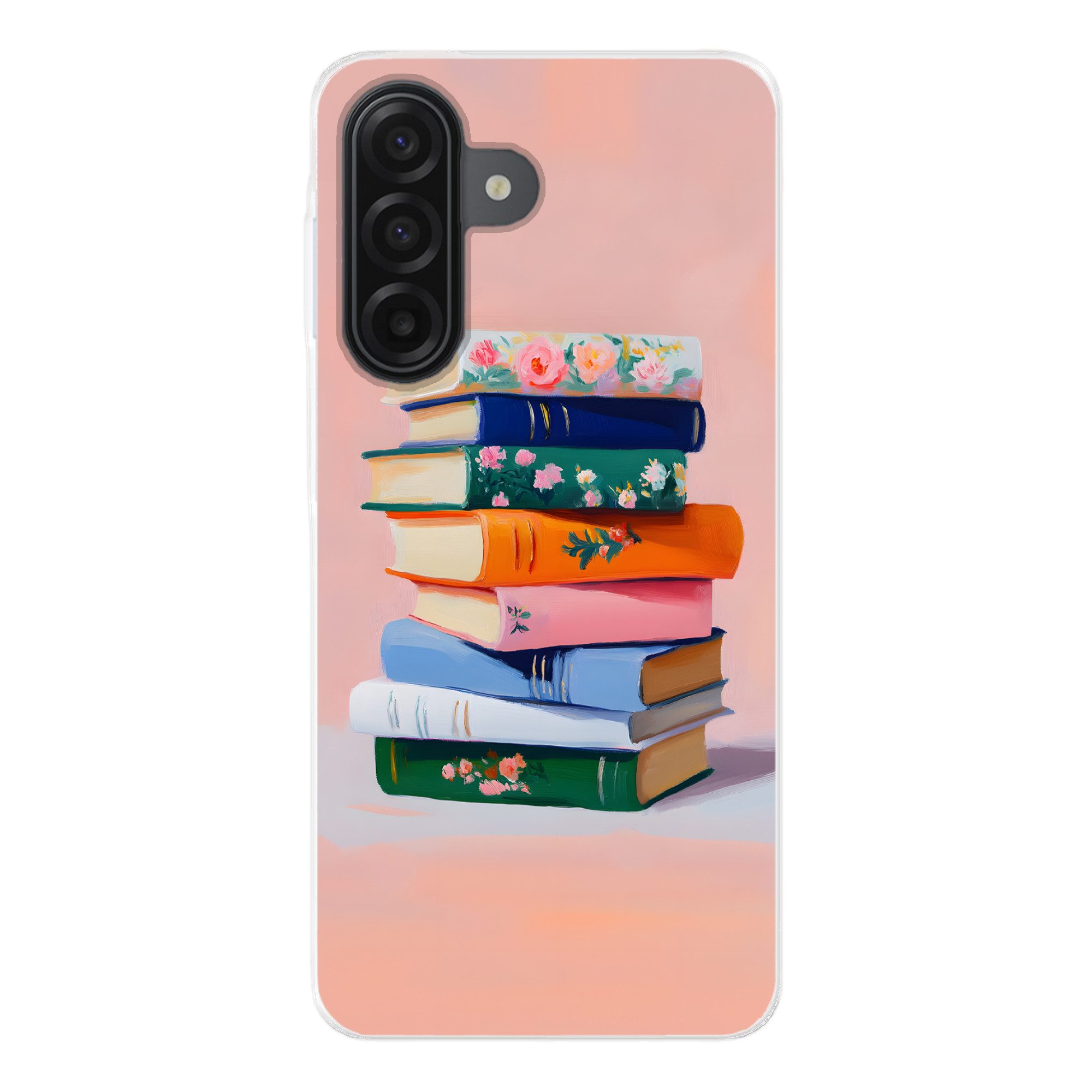 Ein farbenfroher Bücherstapel mit bunten Einbänden und floralen Verzierungen steht vor einem rosafarbenen Hintergrund, der in spielerischer Balance gestapelt ist.