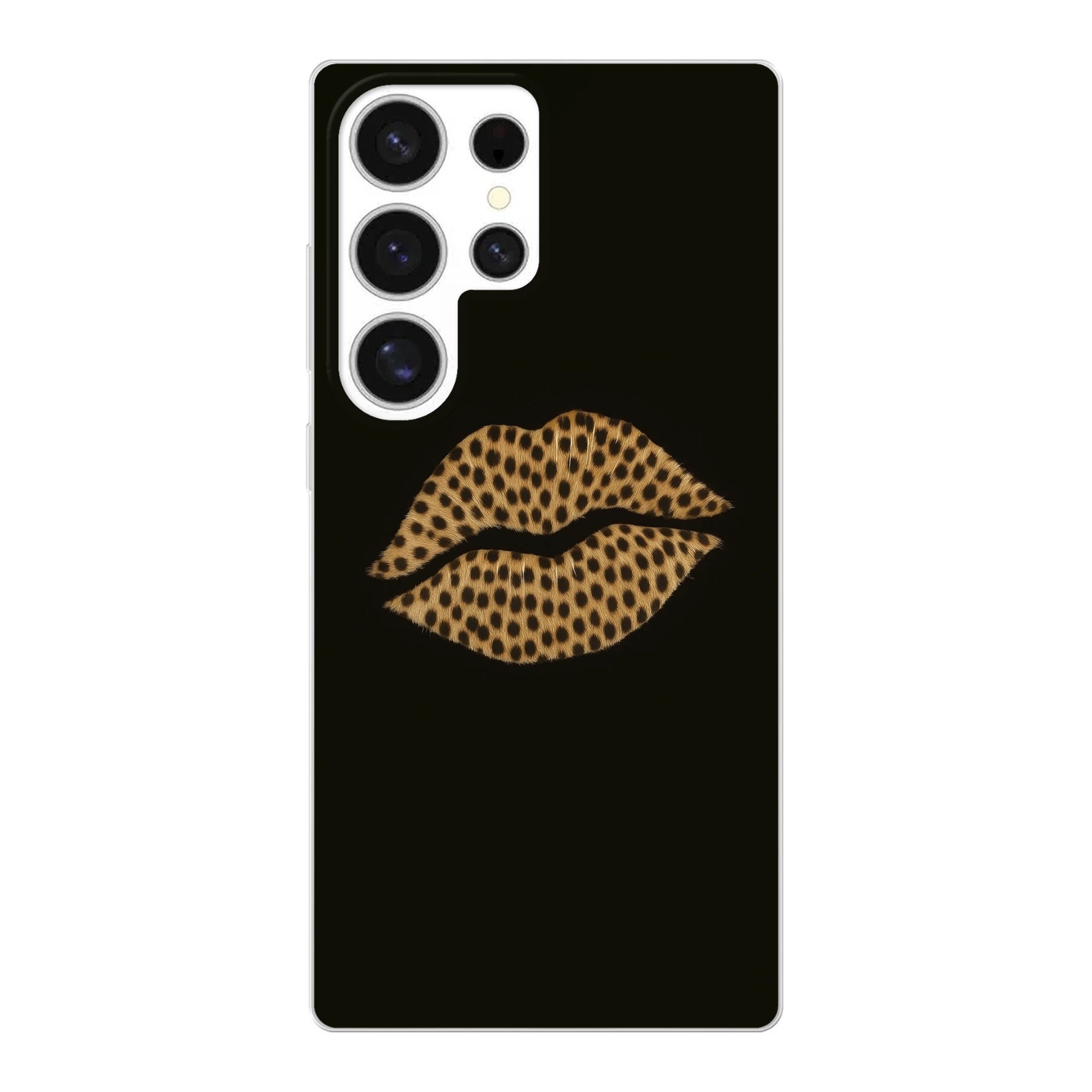 Ein stilisierter Aufdruck von Lippen mit Panther-Motiv steht in scharfem Kontrast zum tiefschwarzen Hintergrund.