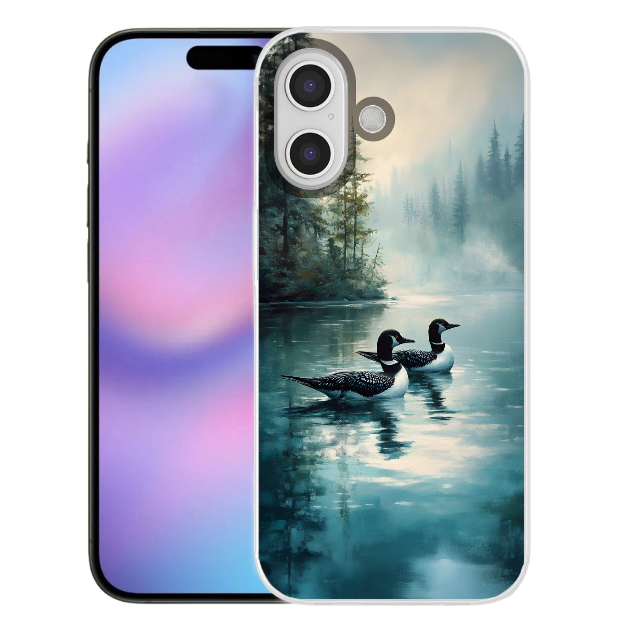 Ein nebliger Waldrand spiegelt sich in einem ruhigen See, in dem zwei schwarz-weiße Wasservögel friedlich schwimmen.