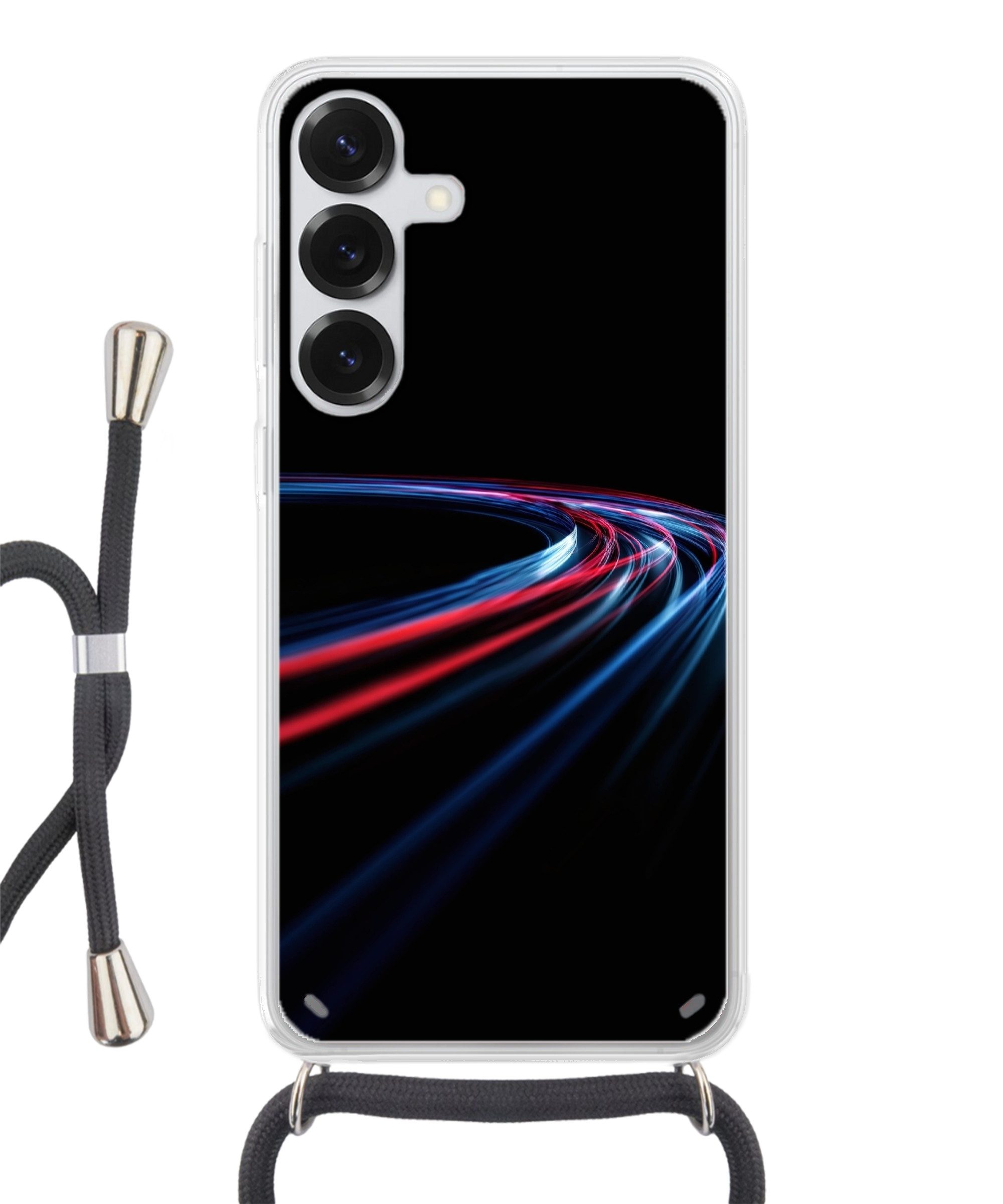Rote und blaue Streifen mit einer geschwungenen Bewegung vermitteln ein Gefühl von Geschwindigkeit und Richtung auf Schwarz.