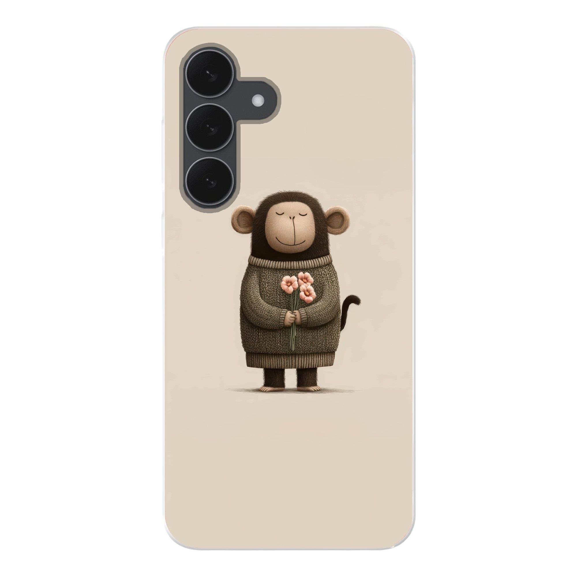 Ein lächelnder Affe mit geschlossenen Augen trägt einen dunkelgrünen Pullover und hält einen Strauß blassrosa Blumen. Er steht aufrecht vor einem neutralen beigen Hintergrund. Der Illustrationsstil ist verspielt und minimalistisch.