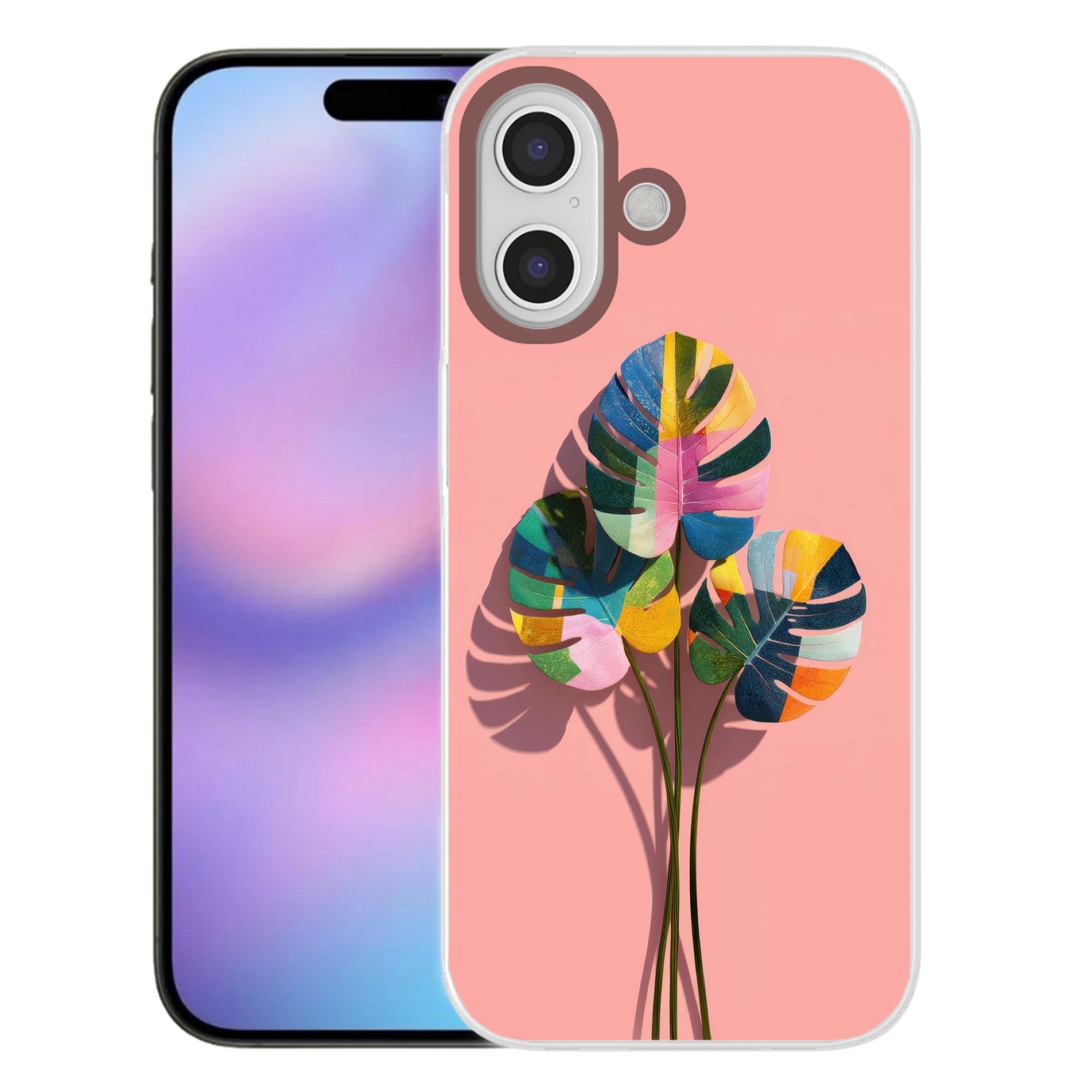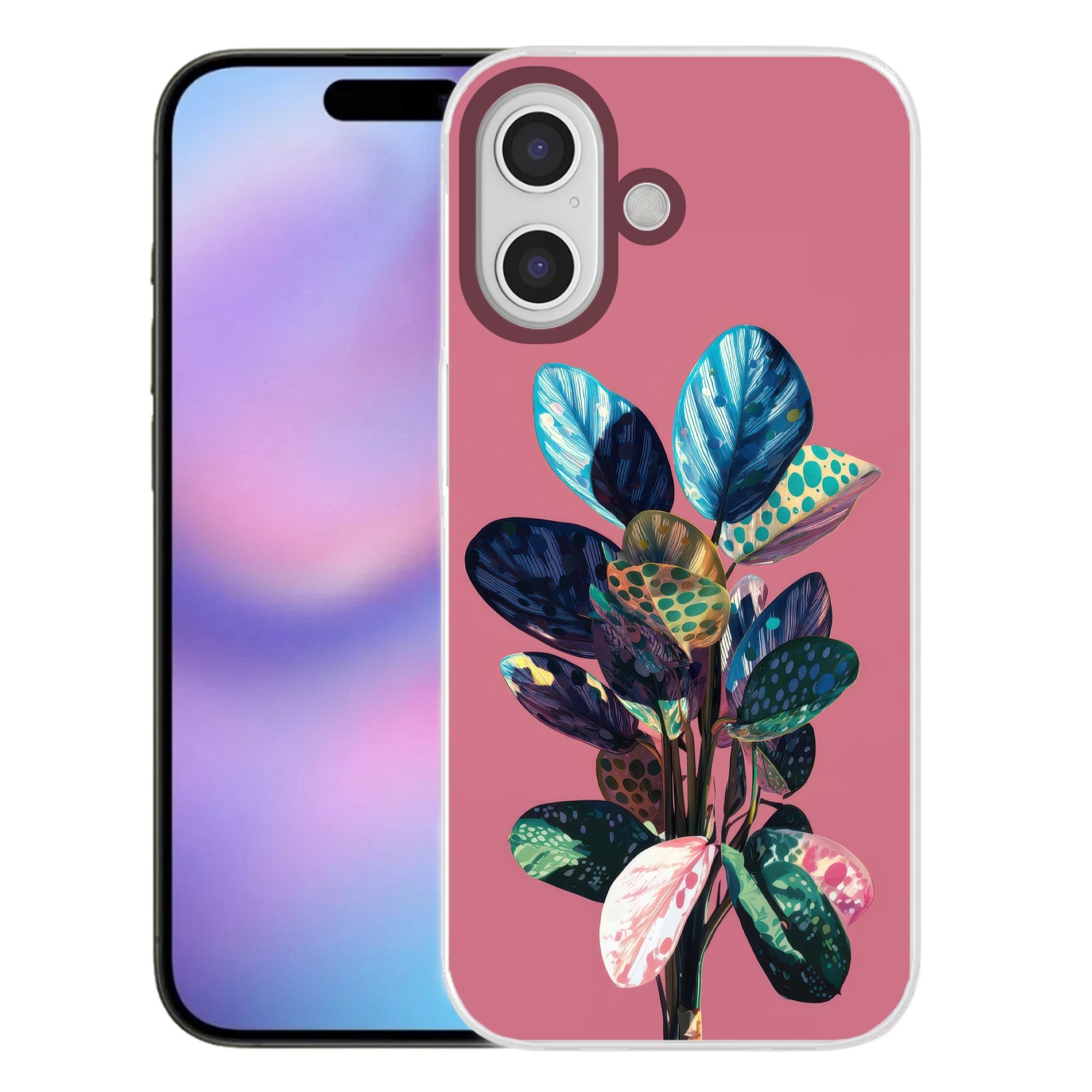 Blätter in Blau- und Grüntönen mit Punkten und Glanz werden vor einem rosa Hintergrund gezeigt. Die Komposition ist ausdrucksstark und modern.