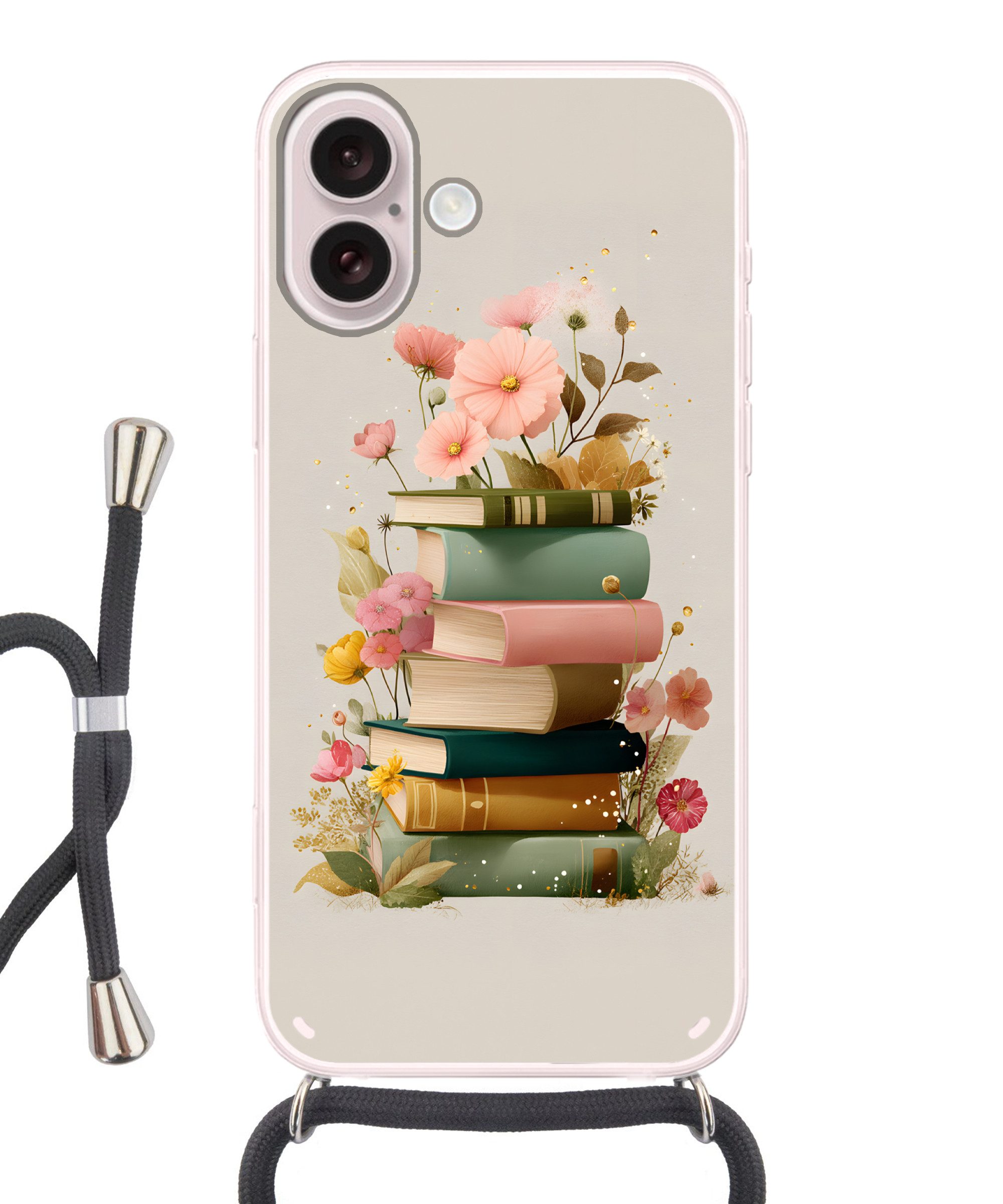 Ein Stapel bunter Bücher wird von zarten Blumen in Pastellfarben umrahmt, die eine verträumte und poetische Atmosphäre hervorrufen.