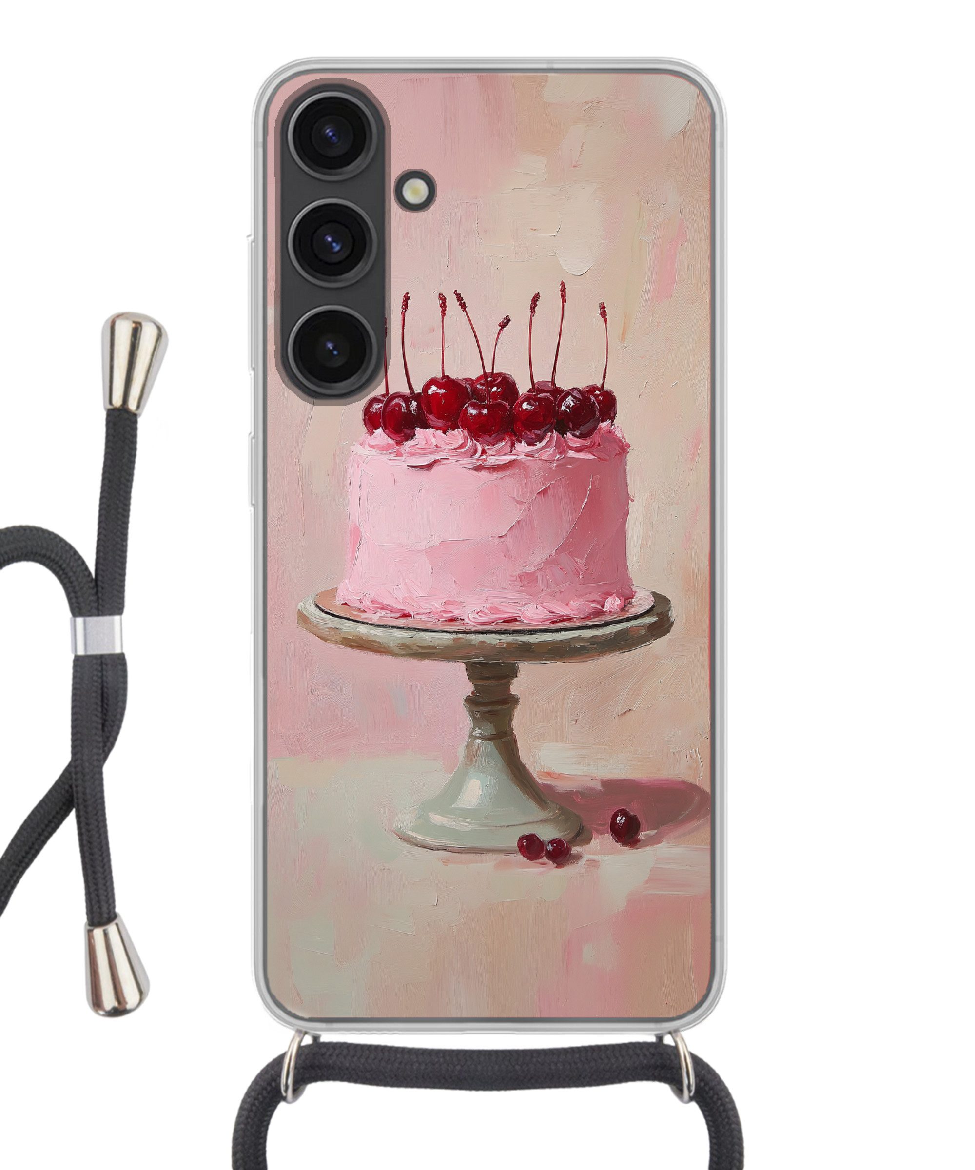 Eine rosafarbene Schlagsahnetorte mit glänzenden Kirschen steht auf einem eleganten Kuchentablett. Der Hintergrund hat eine weiche, malerische Textur in Rosa- und Beigetönen.