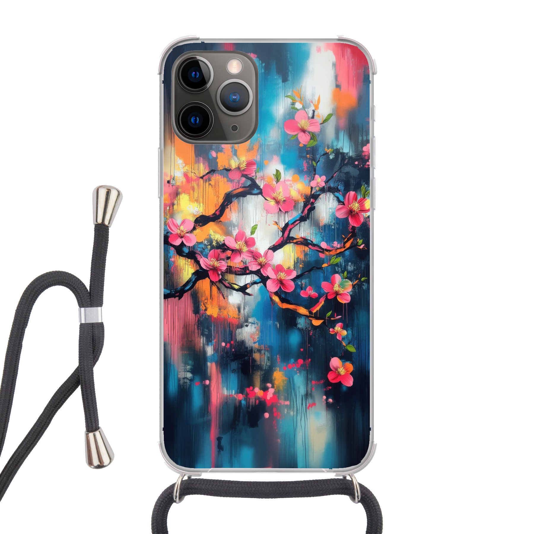 Ein Zweig mit rosa Blüten schlängelt sich über einen bunten Hintergrund. Kräftige Orange- und Blautöne mischen sich mit schwarzen Akzenten und schaffen einen dynamischen Kontrast. Die Blumen scheinen in der abstrakten Atmosphäre des Bildes fast zu schweben, wobei kleine, verspielte Farbspritzer die Szene zum Leben erwecken.